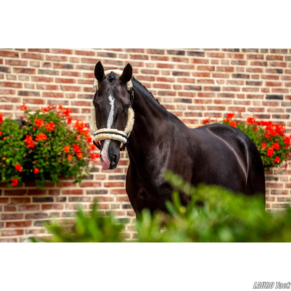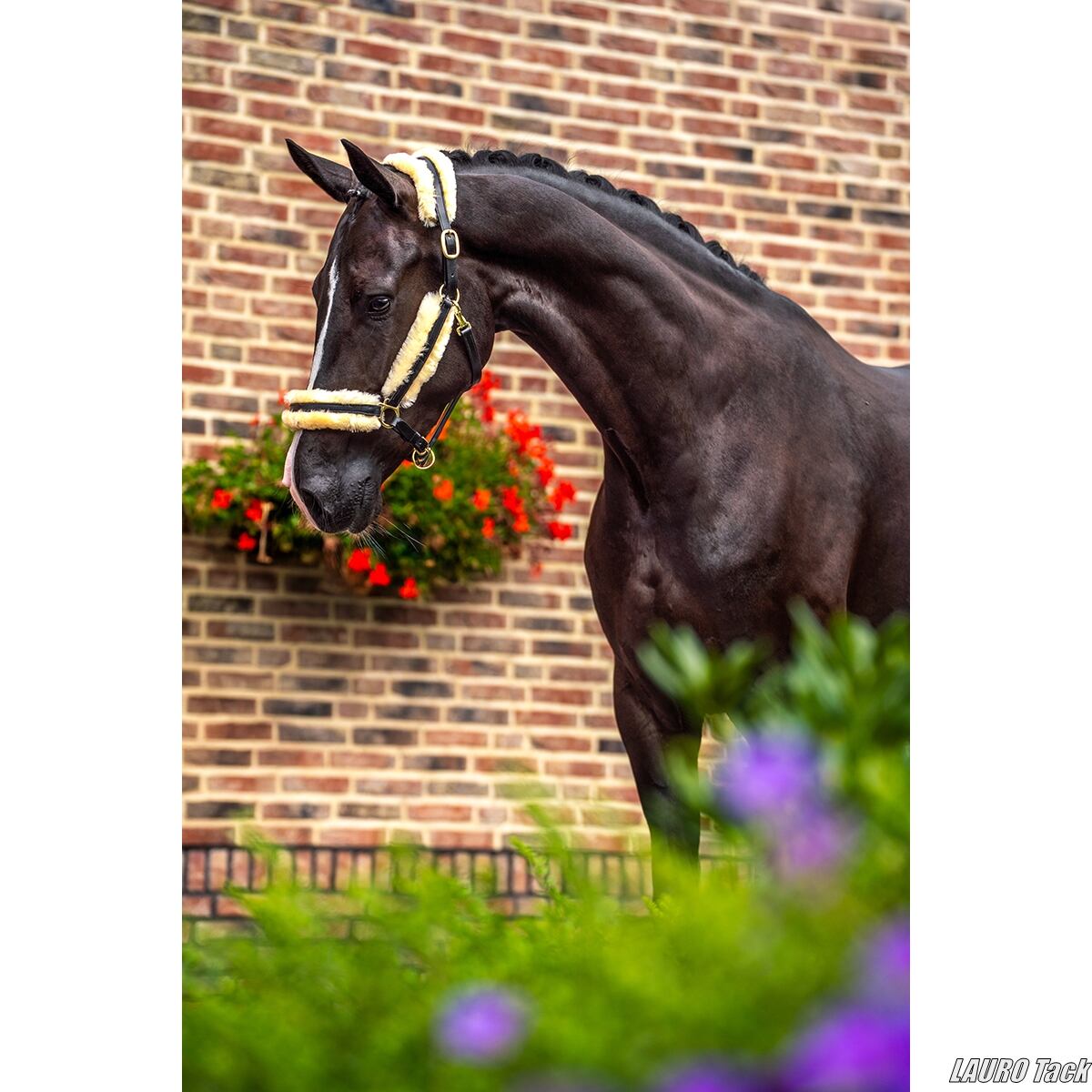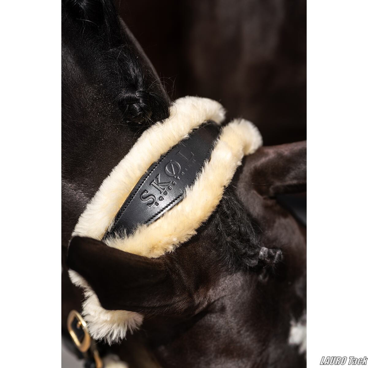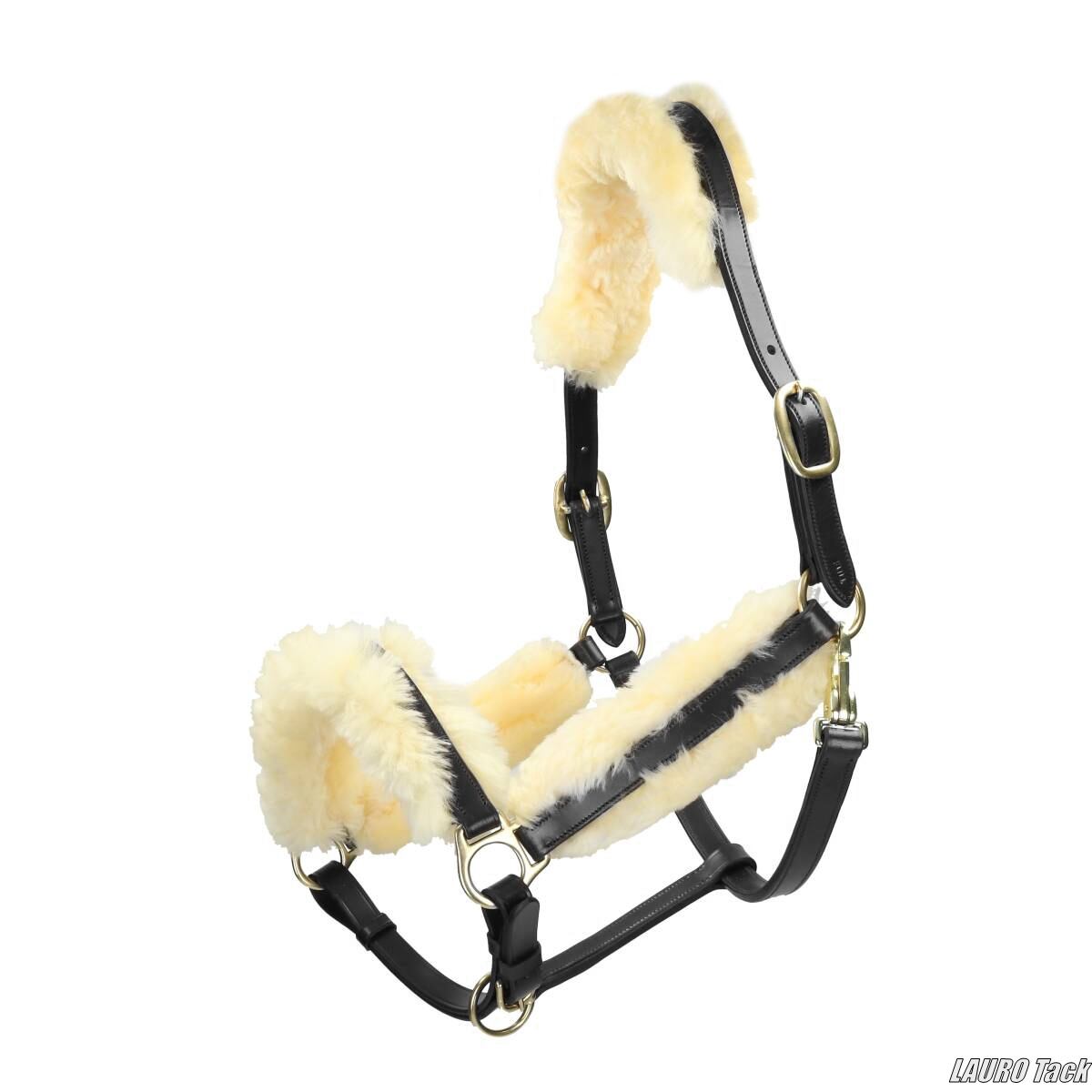 丈夫で非常に柔らかなレザーを使用した高品質な無口です。頭頂部、頬革、鼻革にはフェイクファーのやさしい当て革が施され、馬の頭にやさしくフィットします。鼻革でサイズ調整が可能で、頭頂部も左右それぞれ調整できます。快適な着け心地と高級感のある仕上がりが特徴です。