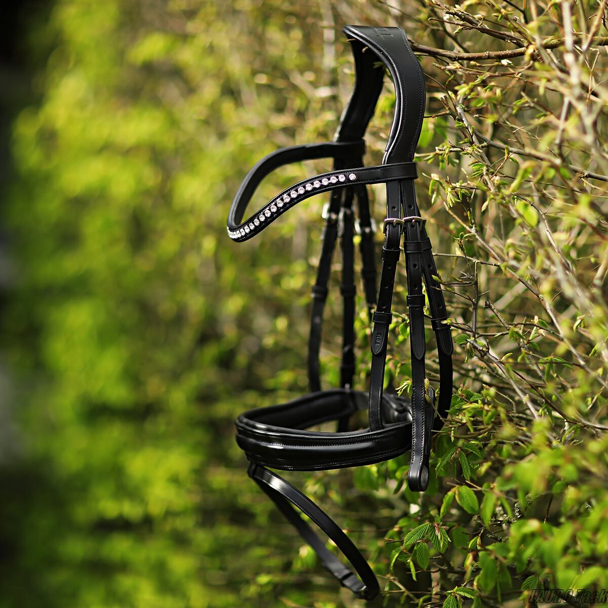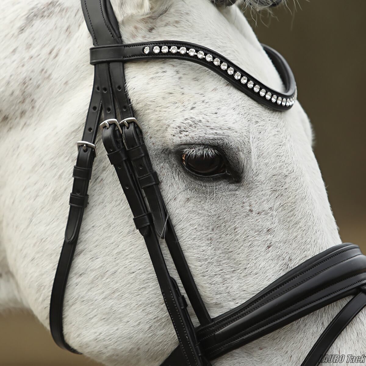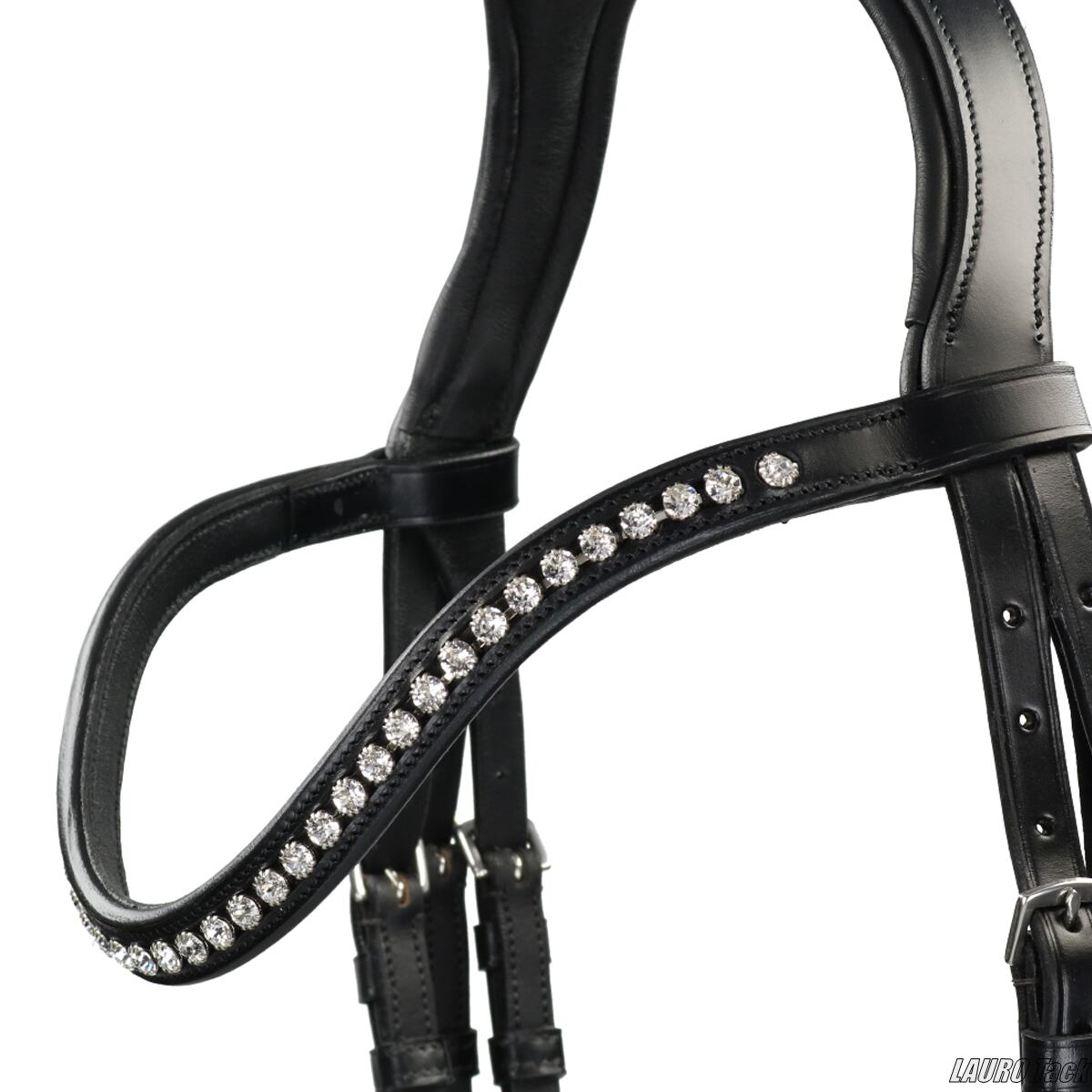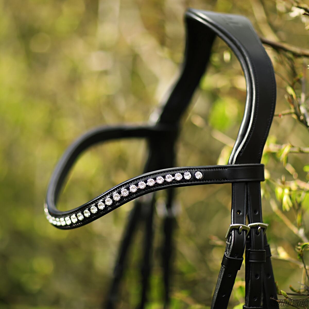 上品な印象の頭絡です。頭頂部は馬の頭に沿う形で、やわらかな当て革付き。鼻革にもソフトな当て革を施しています。幅4.5cmのワイドな鼻革を採用し、額革には美しいクリスタル装飾をあしらっています。喉革は左右調整式で、留め具はブラインドバックル仕様。手綱が付属します。