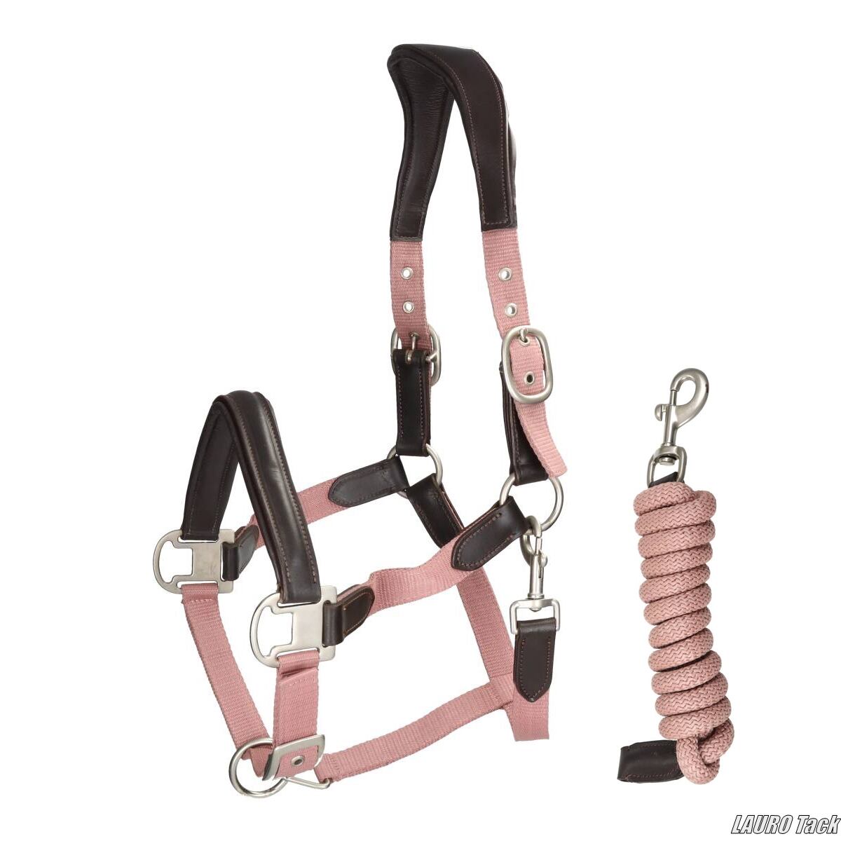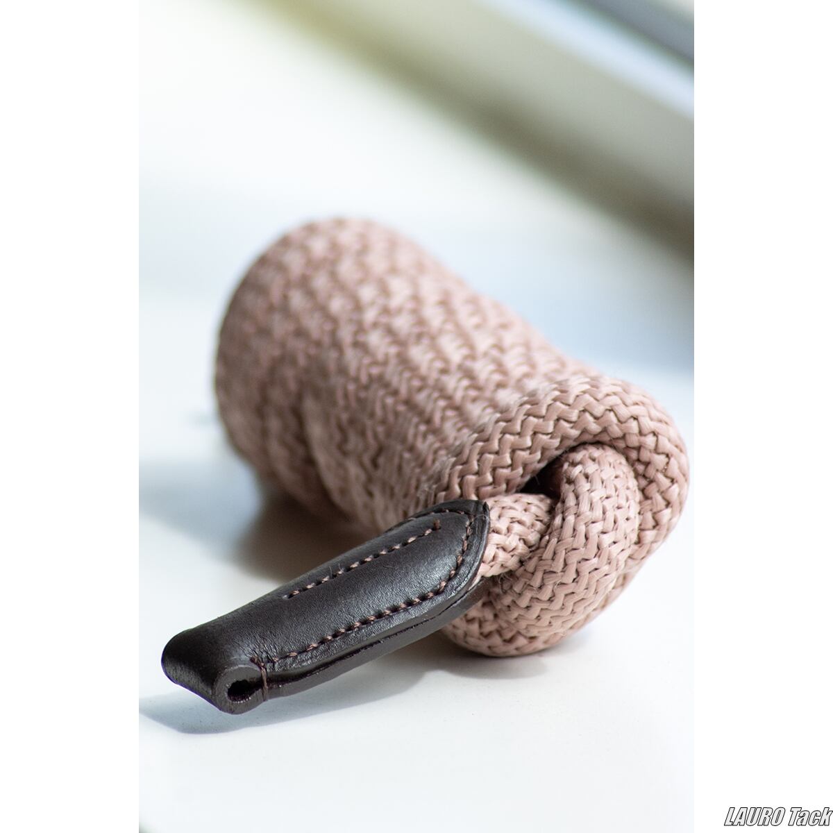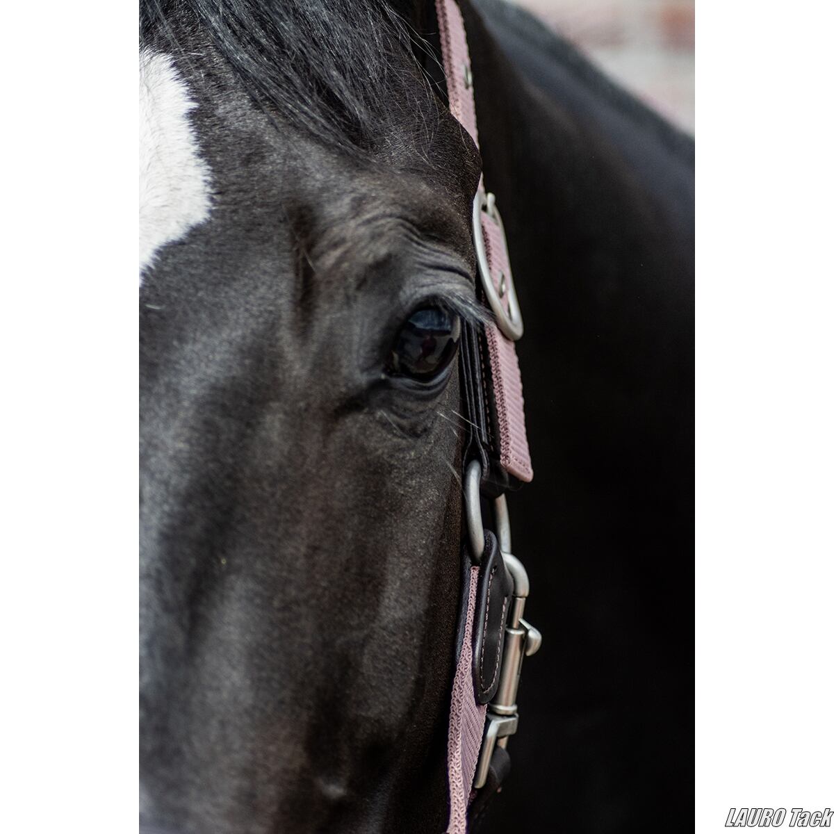 ナイロンとレザーを組み合わせた、無口と引手のセットです。幅広で馬の頭に沿う形の頭頂部により、耳の後ろへの圧を分散しやすい設計です。頭頂部と鼻革にはレザーの当て革を施し、使うほど頭のラインに馴染みます。頭頂部は左右で、鼻革も調整可能。金属リング付き調整穴とシルバーカラー金具を採用し、引手が付属します。
