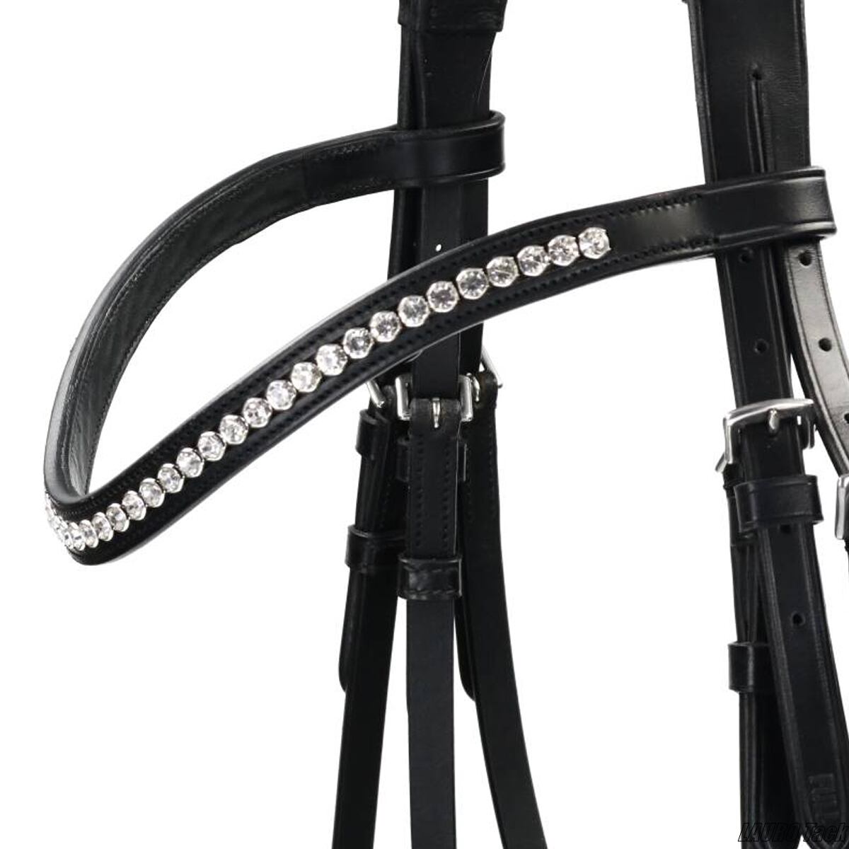 非常に柔らかなプレミアムレザーを使用した高級頭絡です。幅広の頭頂部は耳まわりにゆとりのある形で、やわらかなレザーの当て革が高い快適性を提供します。鼻革にもソフトな裏当てが施され、締め具は取り外し可能な構造です。クリスタル装飾の額革が上品な印象で、シルバーカラーの金具を採用。手綱が付属します。