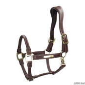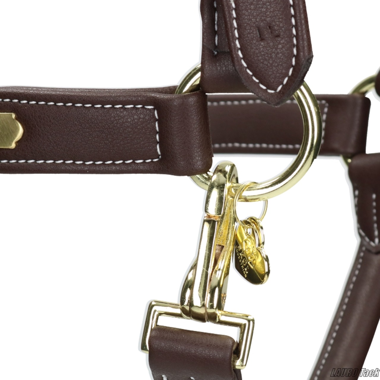 頭頂部が馬の頭に沿う形に作られた、高級感のある無口です。頭頂部には非常に柔らかな当て革が施され、快適な装着感に配慮しています。頭頂部は左右で大きく調整でき、顎下にはワンタッチ留めを備えています。コントラストステッチが上品な印象で、名入れなどのカスタマイズが可能なプレート付きです。素材は合成皮革です。