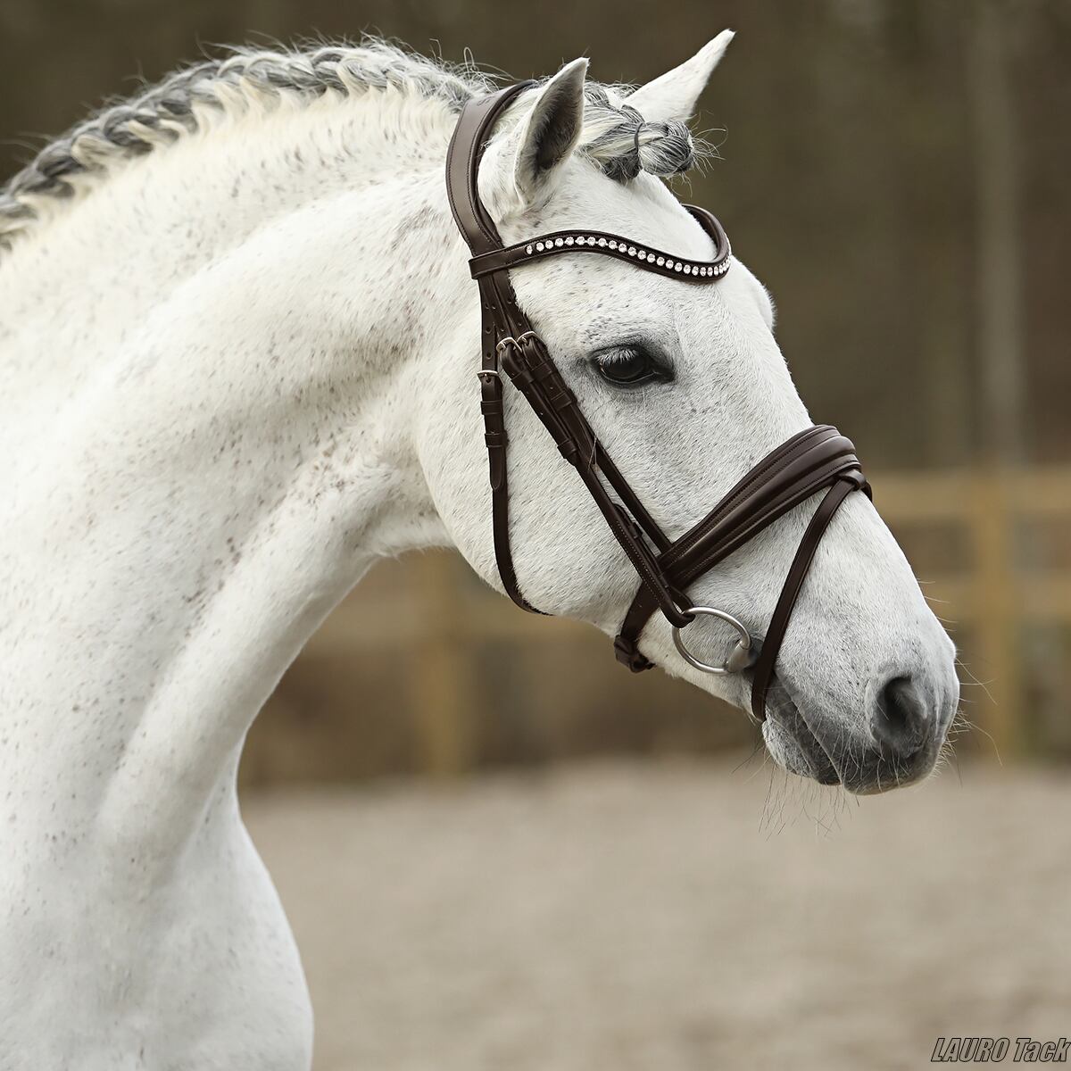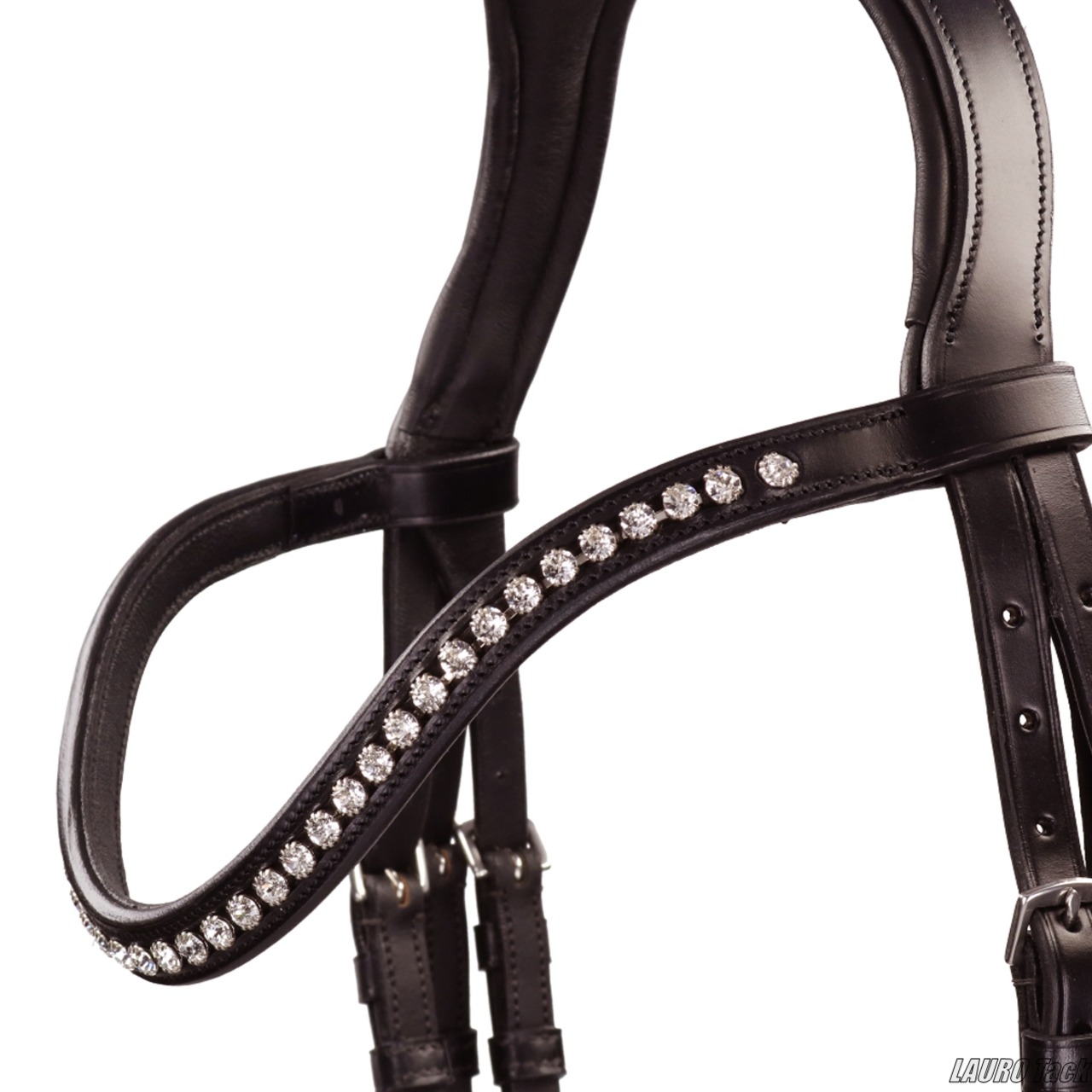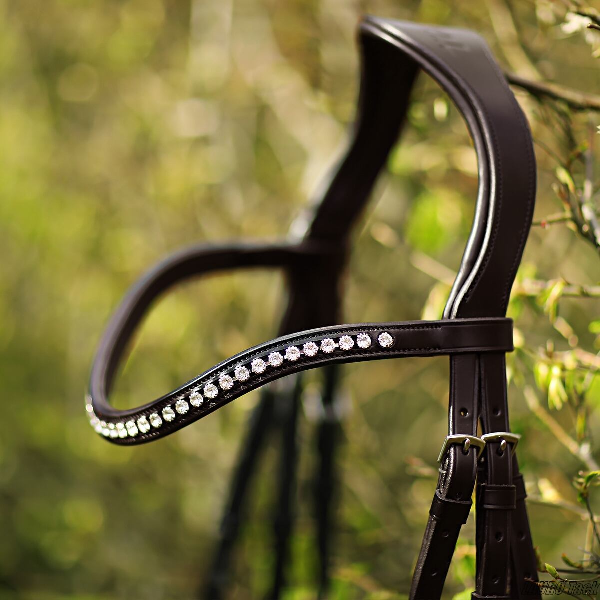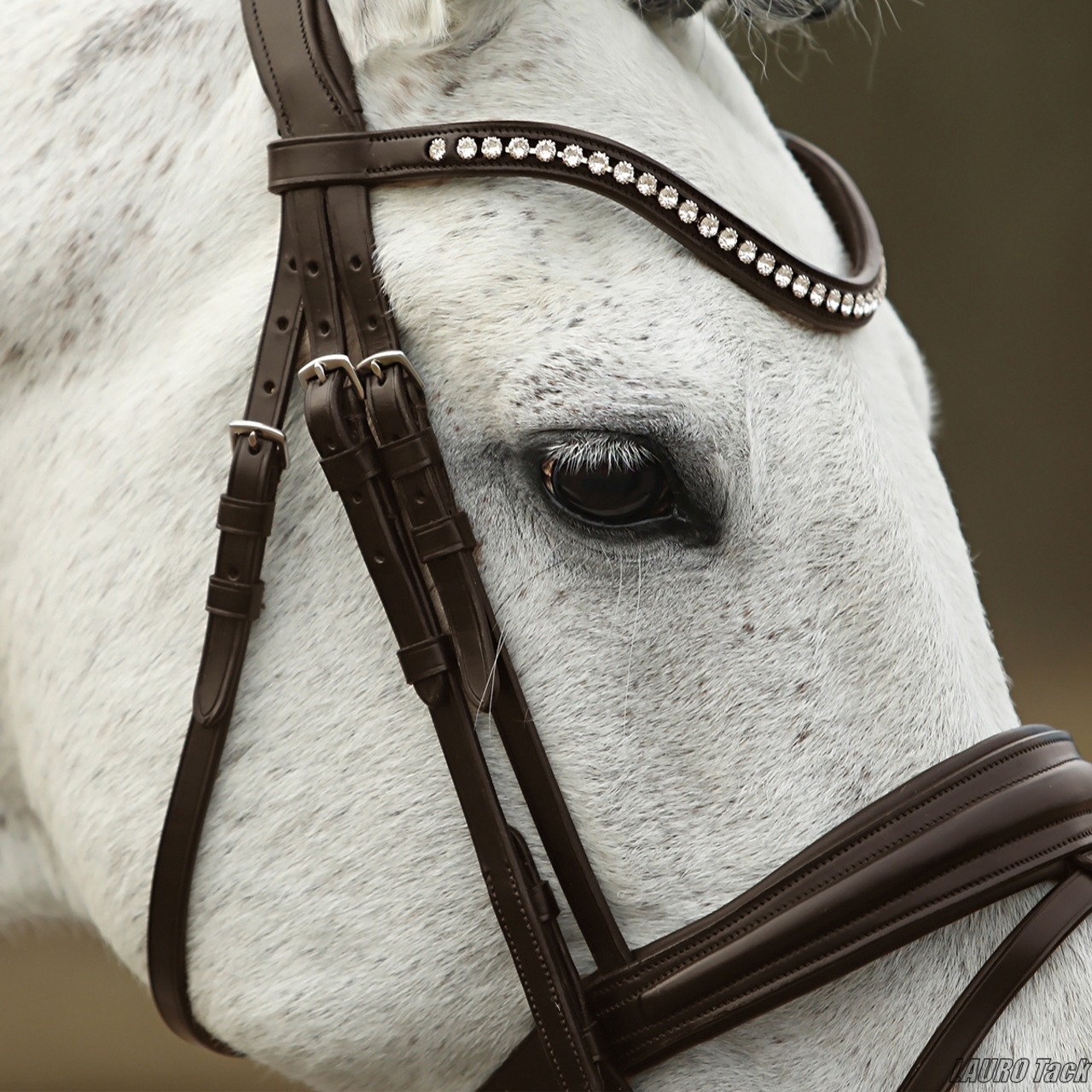 上品で高級感のある頭絡です。頭頂部は耳まわりにゆとりのある形で、やわらかな当て革により圧を分散します。鼻革にもソフトな当て革を施し、快適性に配慮しています。幅4.5cmのワイドな鼻革を採用し、額革には美しいクリスタル装飾をあしらっています。喉革は左右調整式で、留め具はブラインドバックル仕様です。手綱が付属します。
