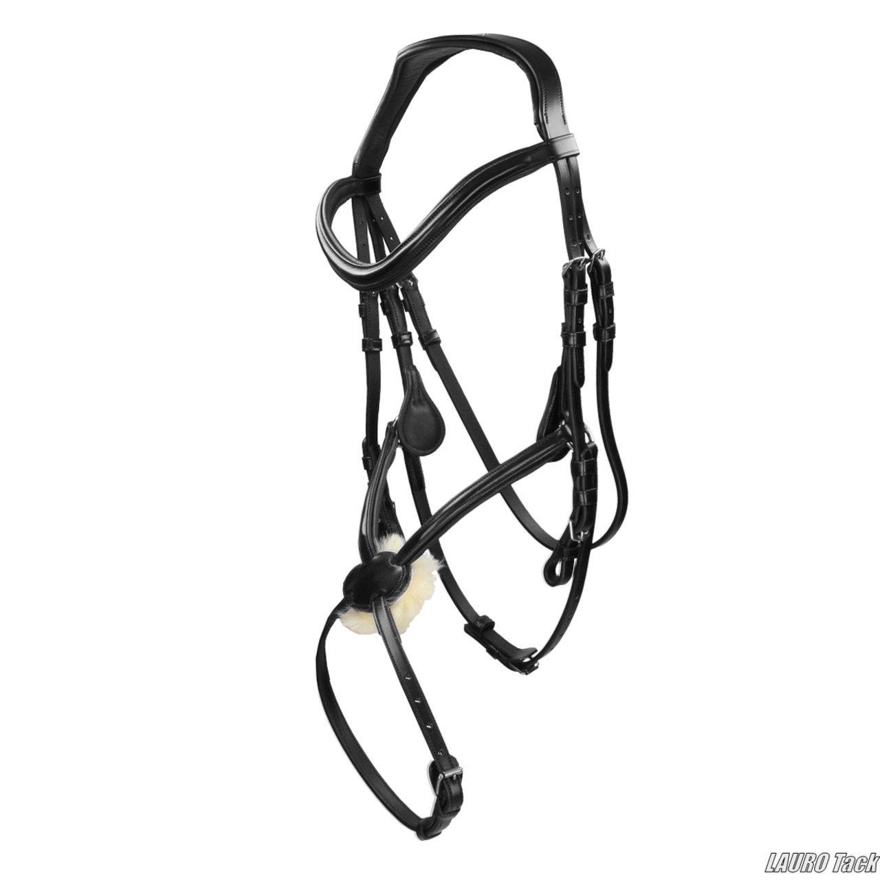 上品で高級感のある頭絡です。頭頂部は耳まわりにゆとりのある形で、やわらかな当て革により圧を分散します。フェイクファーで裏当てされたクロス鼻革を採用し、鼻梁に当たる部分にもソフトな当て革を施しています。左右に保護パーツを備え、喉革は左右調整式です。留め具はブラインドバックル仕様で、ストッパー付きの手綱が付属します。専用バッグ入りです。