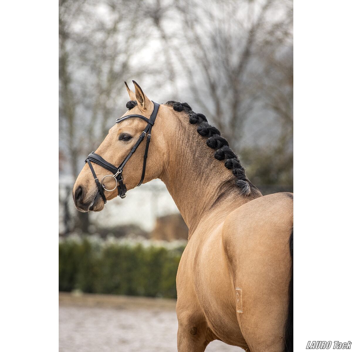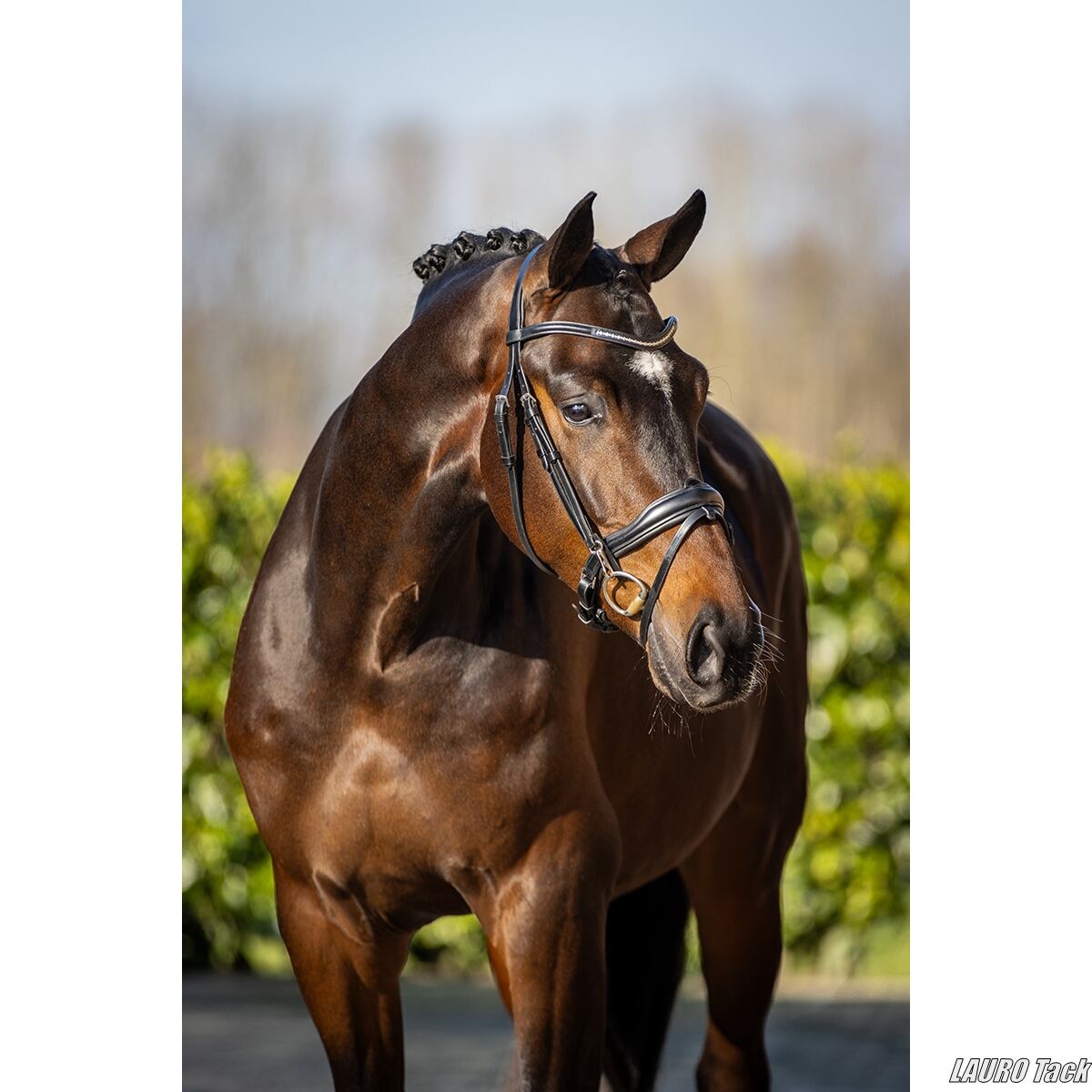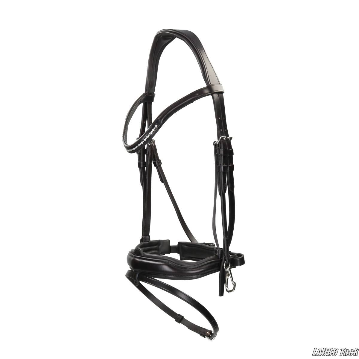 高品質レザーを使用した、ラグジュアリーな頭絡です。頭頂部と鼻革には非常に柔らかな当て革を施し、耳の後ろにかかる圧を逃がしやすい形状です。クランク式の鼻革にはソフトレザーの当て革が付き、馬の頭をやさしく保護します。装飾の美しい額革が印象的なモデルです。