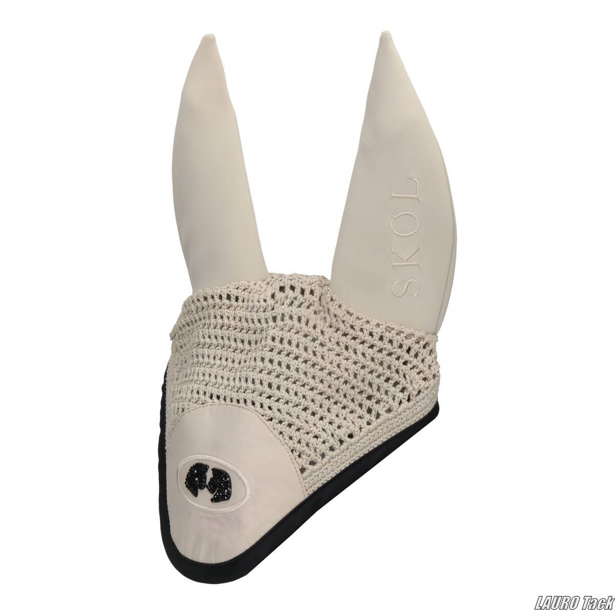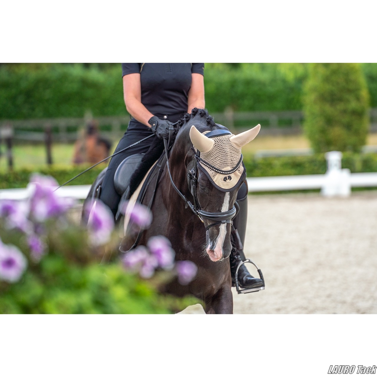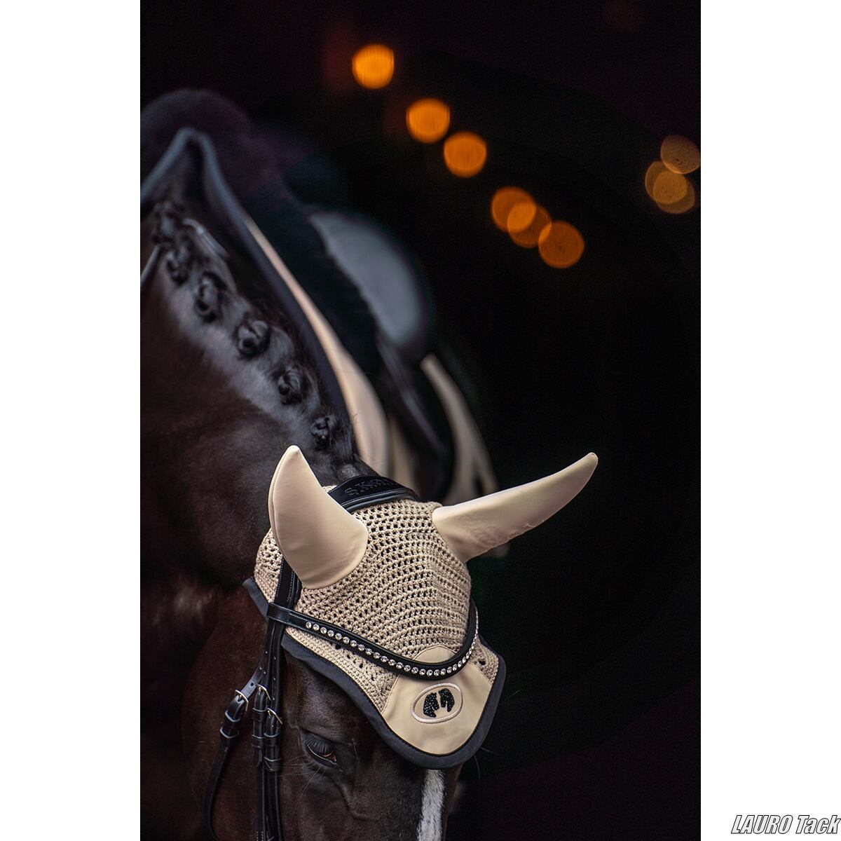 スタイリッシュなイヤーネット(フライベール)です。しっかりとした編み込み部分と、同色生地のフロント部分を組み合わせ、ラインストーンで上品に仕上げています。耳部分には遮音性のあるしっかりした素材を使用し、物音に敏感な馬の集中をサポートします。
