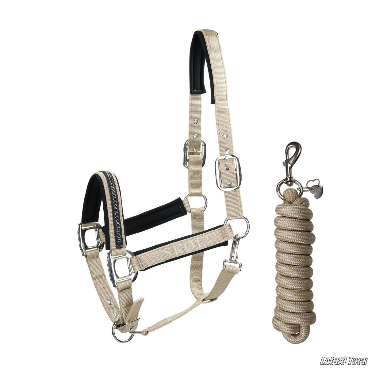 スタイリッシュで丈夫な無口と引手のセットです。鼻革、頬革、頭頂部にはブラックのネオプレン素材でやさしく当て革を施し、快適な着け心地に配慮しています。鼻革にはブラックのラインストーンをあしらい、頬部分にはロゴ刺繍入り。シルバーカラーのリングが上品なアクセントになっています。頭頂部は左右で調整可能で、シルバー調ディテールの引手とナスカン付きフックが付属します。