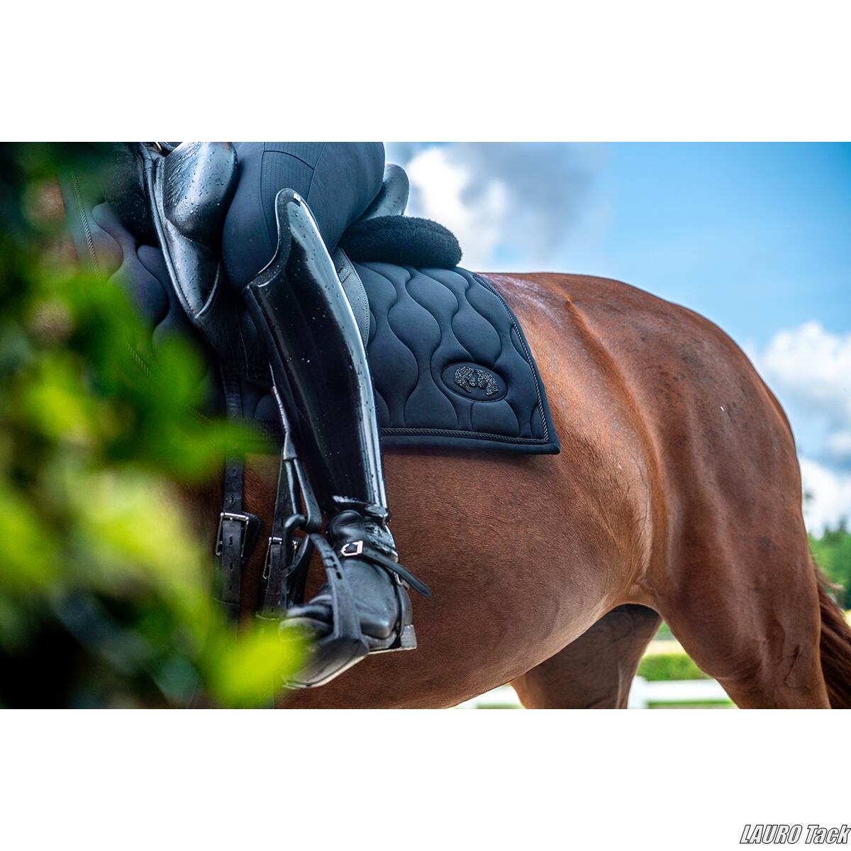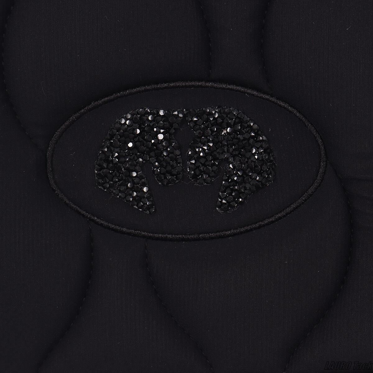 馬場鞍用のゼッケンです。背中のラインに沿う形状で、鞍下で位置が安定しやすい設計です。内側には通気性のある裏地を使用し、快適性に配慮しています。トレンド感のあるキルティングと、片側に配置されたロゴがポイントです。鞍の下でズレにくいよう、腹帯を通して固定できるベルトが付いています。