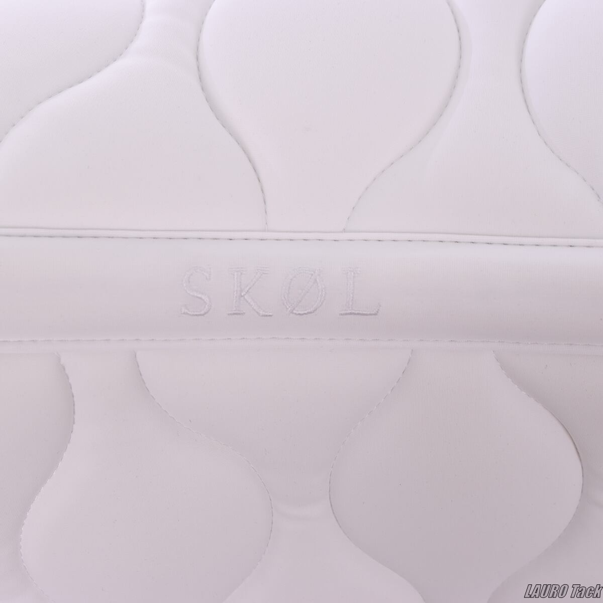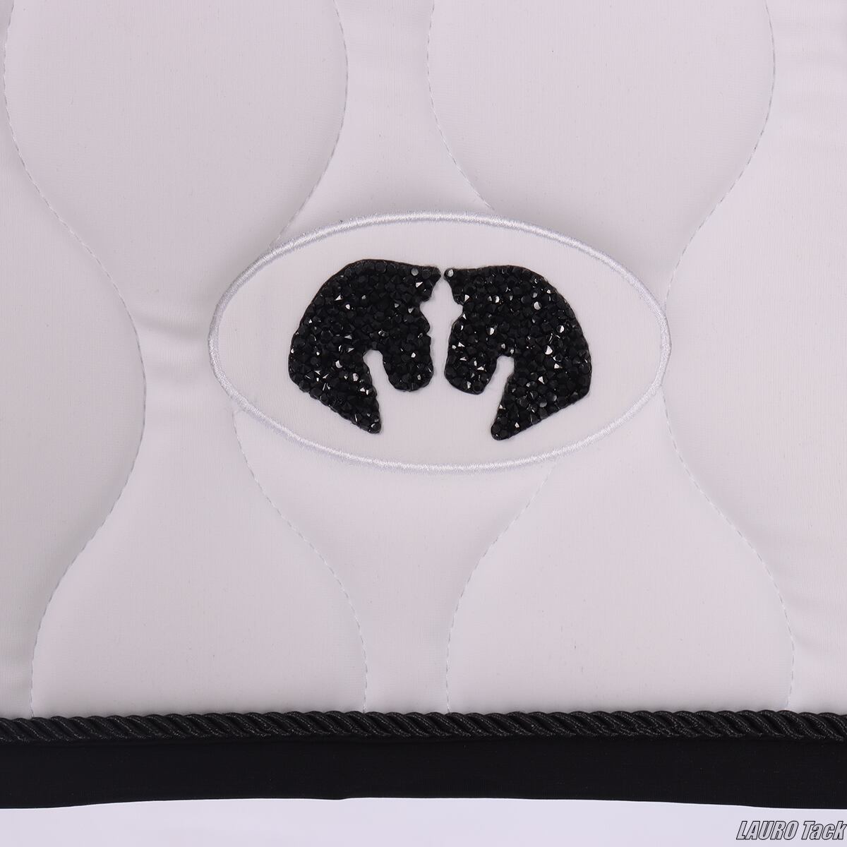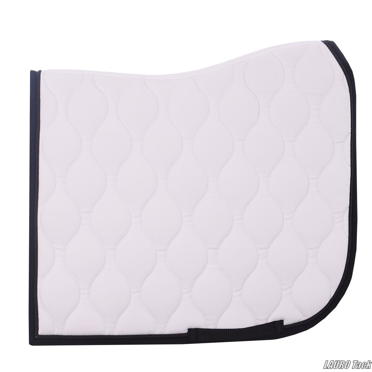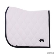 馬場鞍用のゼッケンです。背中のラインに沿う形状で、鞍下で位置が安定しやすい設計です。内側には通気性のある裏地を使用し、快適性に配慮しています。トレンド感のあるキルティングと、片側に配置されたロゴがポイントです。鞍の下でズレにくいよう、腹帯を通して固定できるベルトが付いています。