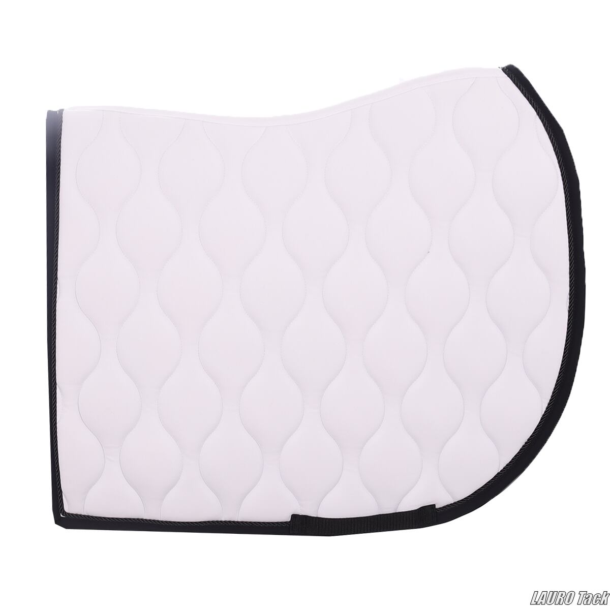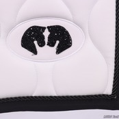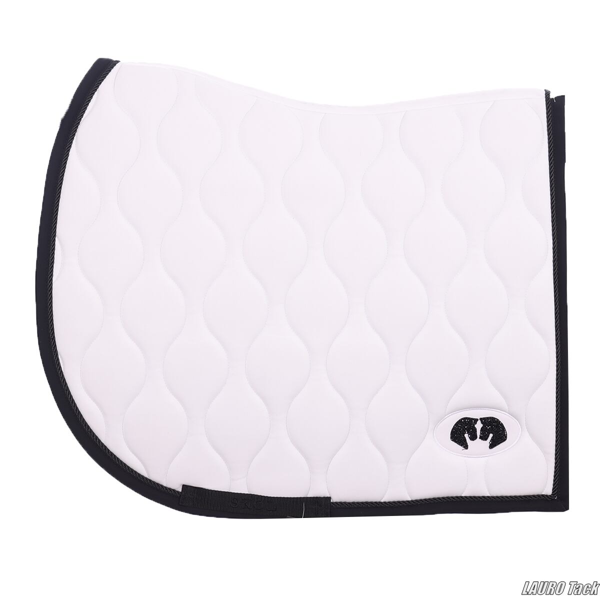 馬場鞍にも障害鞍にも使える汎用ゼッケンです。背中のラインに沿う形状で、鞍下で位置が安定しやすい設計です。内側には通気性のある裏地を使用し、快適性に配慮しています。トレンド感のあるキルティングと、片側に配置されたロゴがポイントです。鞍の下でズレにくいよう、腹帯を通して固定できるベルトが付いています。