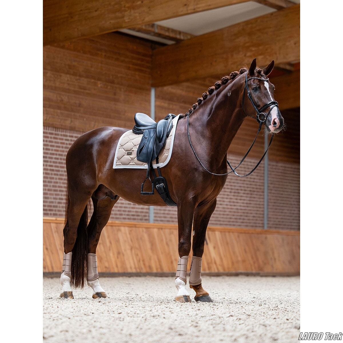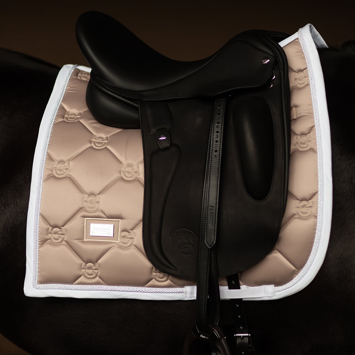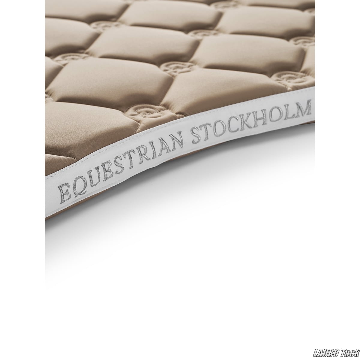 Equestrian StockholmのSandコレクションの馬場用ゼッケン。速乾性と湿気調整機能に優れた裏地を使用し、快適な状態を長時間キープします。背中の形に沿う立体的な設計でフィット感が高く、腹帯と鞍用ループにより安定した装着が可能。落ち着いたベージュカラーにホワイトとシルバーの装飾を施し、コーナーにはメタルロゴプレートを配置した上品なデザインです。
