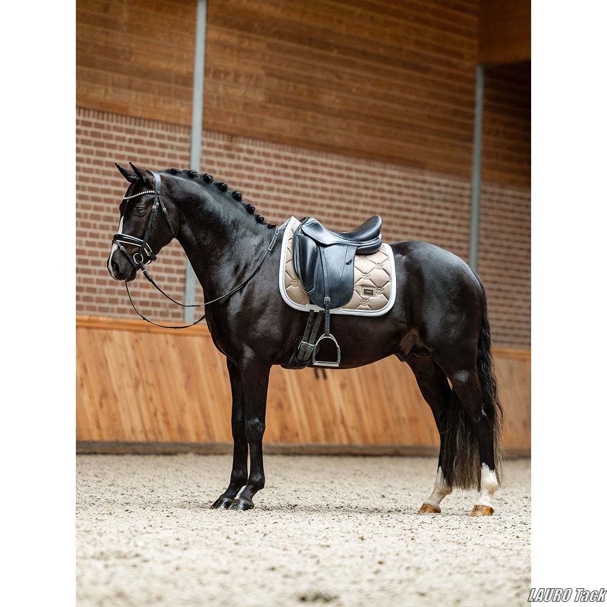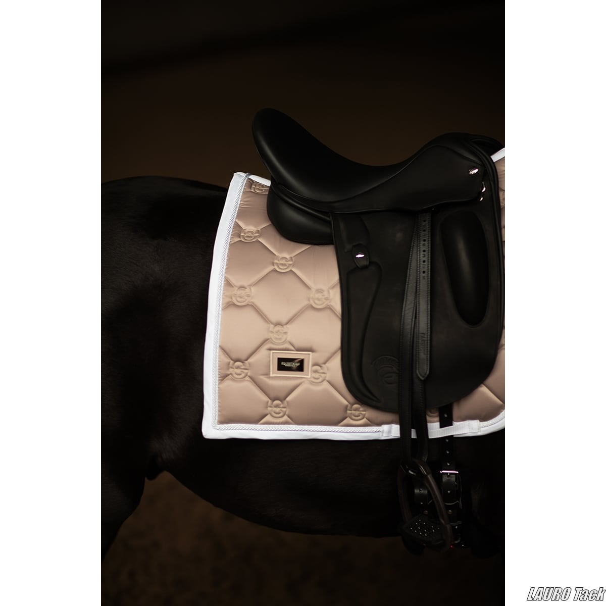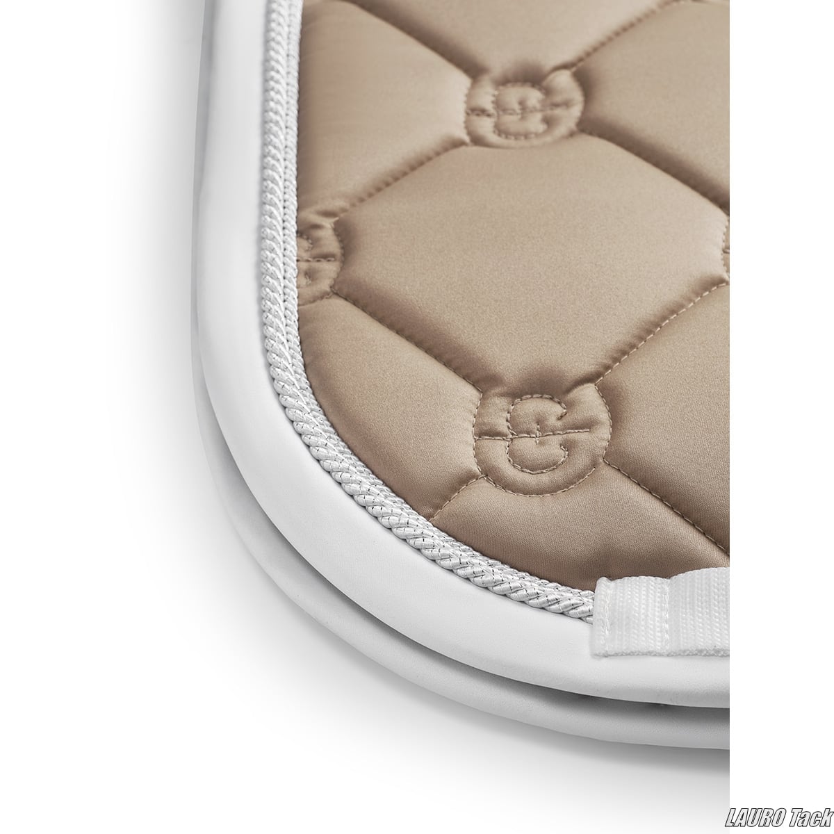 Equestrian StockholmのSandコレクションの馬場用ゼッケン。速乾性と湿気調整機能に優れた裏地を使用し、快適な状態を長時間キープします。背中の形に沿う立体的な設計でフィット感が高く、腹帯と鞍用ループにより安定した装着が可能。落ち着いたベージュカラーにホワイトとシルバーの装飾を施し、コーナーにはメタルロゴプレートを配置した上品なデザインです。