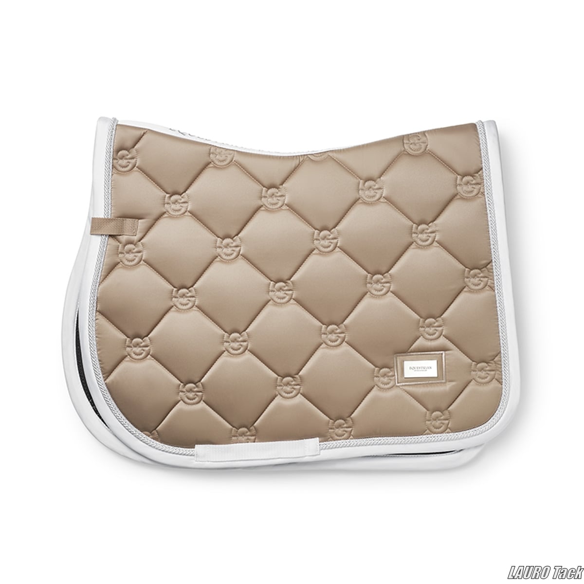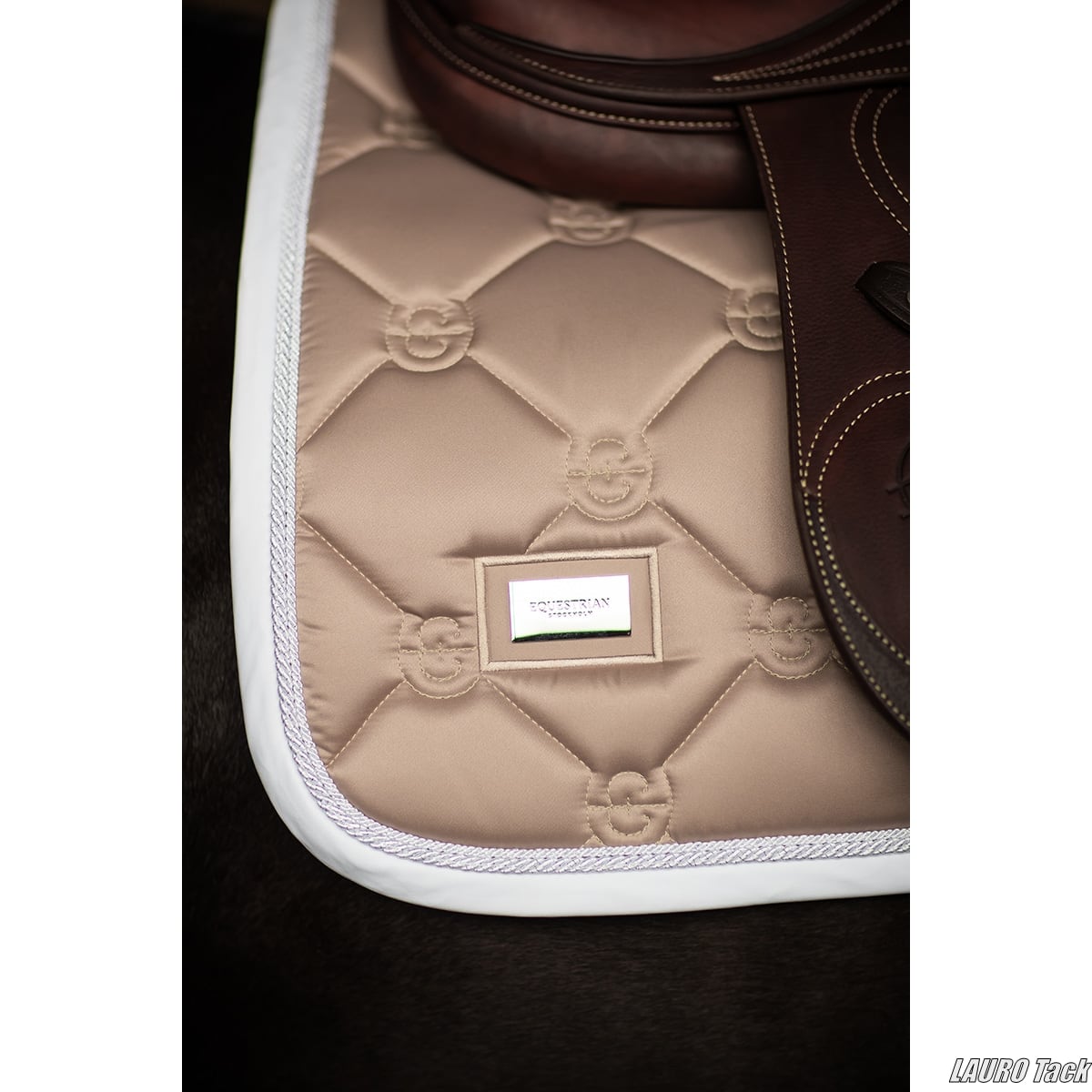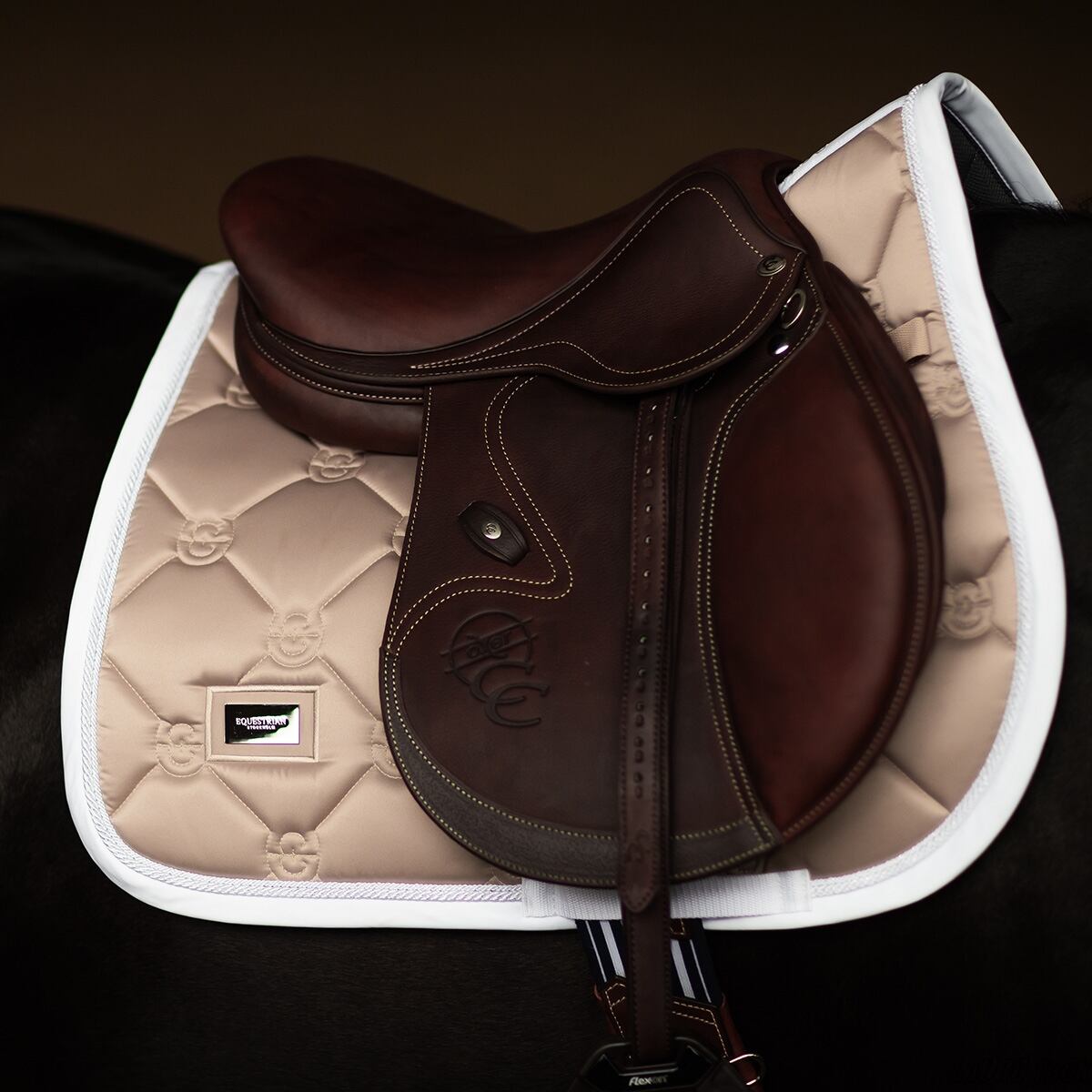 Equestrian StockholmのSandコレクションの障害用ゼッケン。速乾性と湿気調整機能を備えた裏地により、運動中も快適な状態を保ちます。背中のラインに沿った形状でフィット感が良く、腹帯と鞍用ループがズレを防止。ベージュを基調にホワイトとシルバーのディテールを組み合わせ、上品さと実用性を兼ね備えた一枚です。