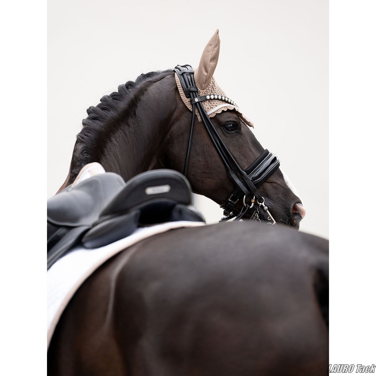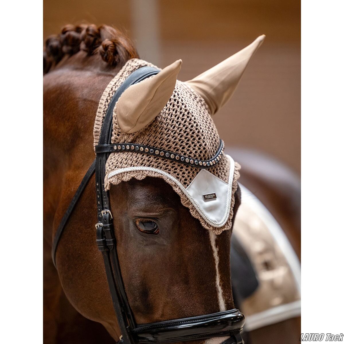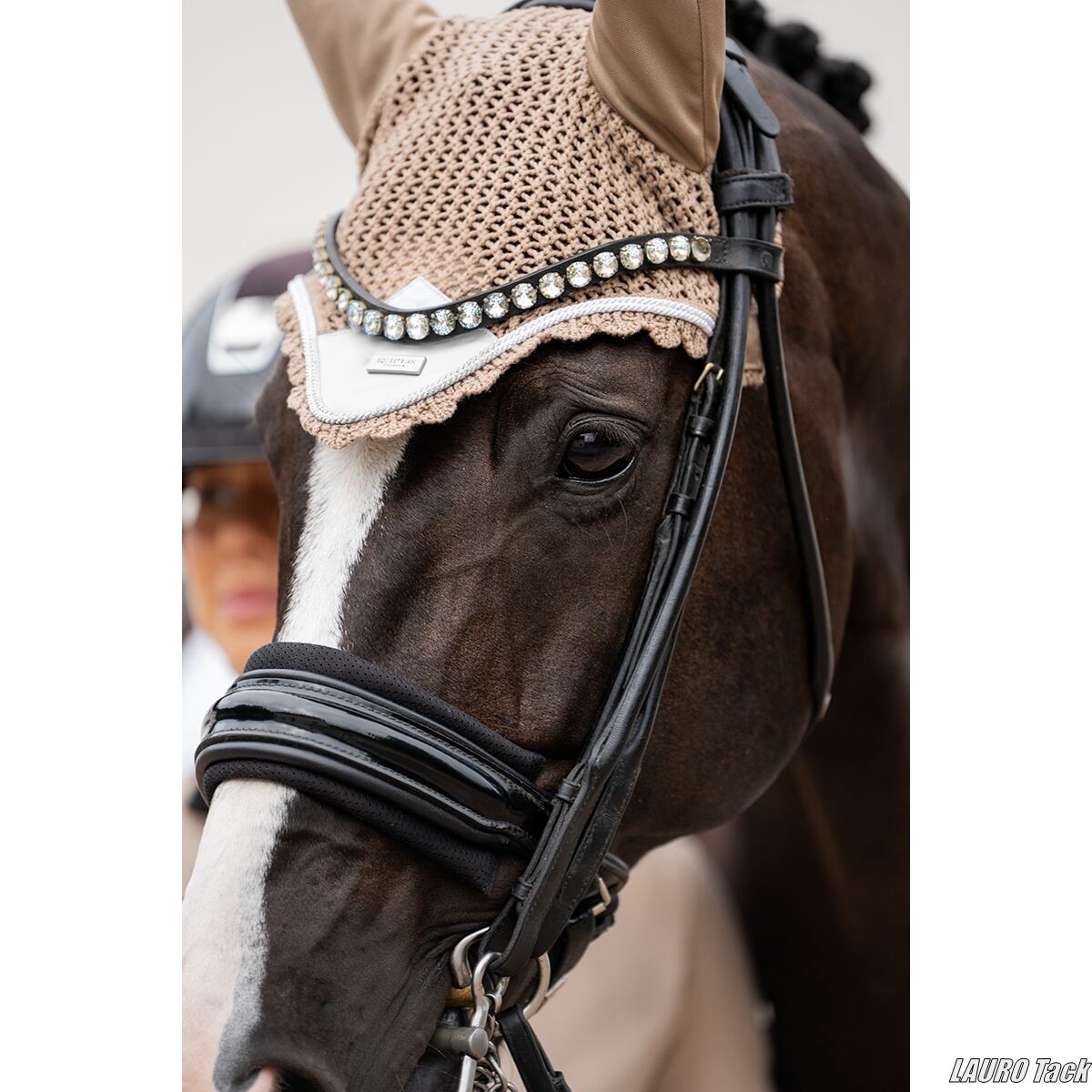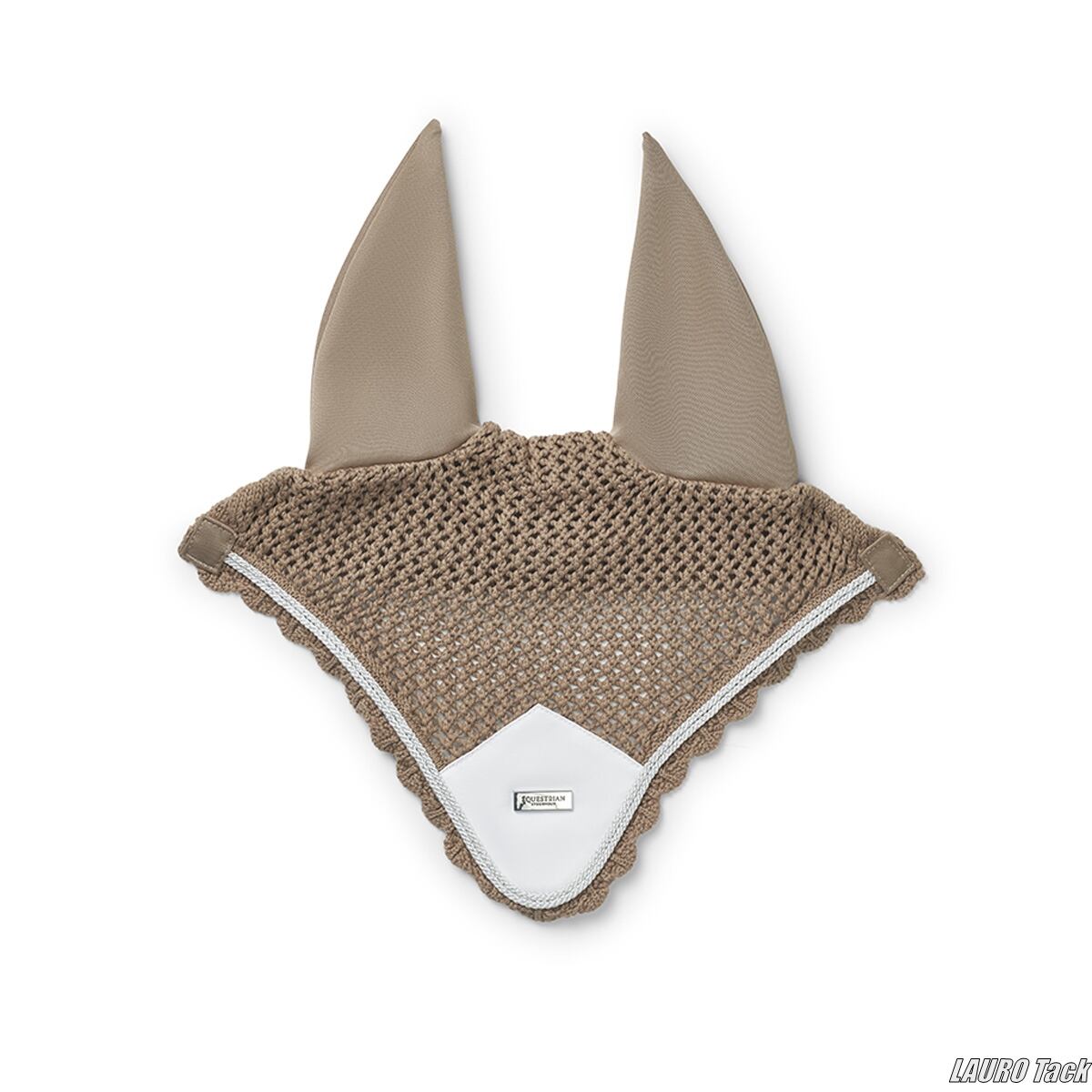 Equestrian StockholmのSandコレクションのイヤーネット。かぎ針編みのコットン素材を使用し、耳部分には伸縮性のある素材を採用しています。馬の耳をハエや虫から守りながら、快適な着け心地を実現。先端にはシルバーのロゴプレートをあしらい、同コレクションのゼッケンと合わせたコーディネートにもよく映えます。