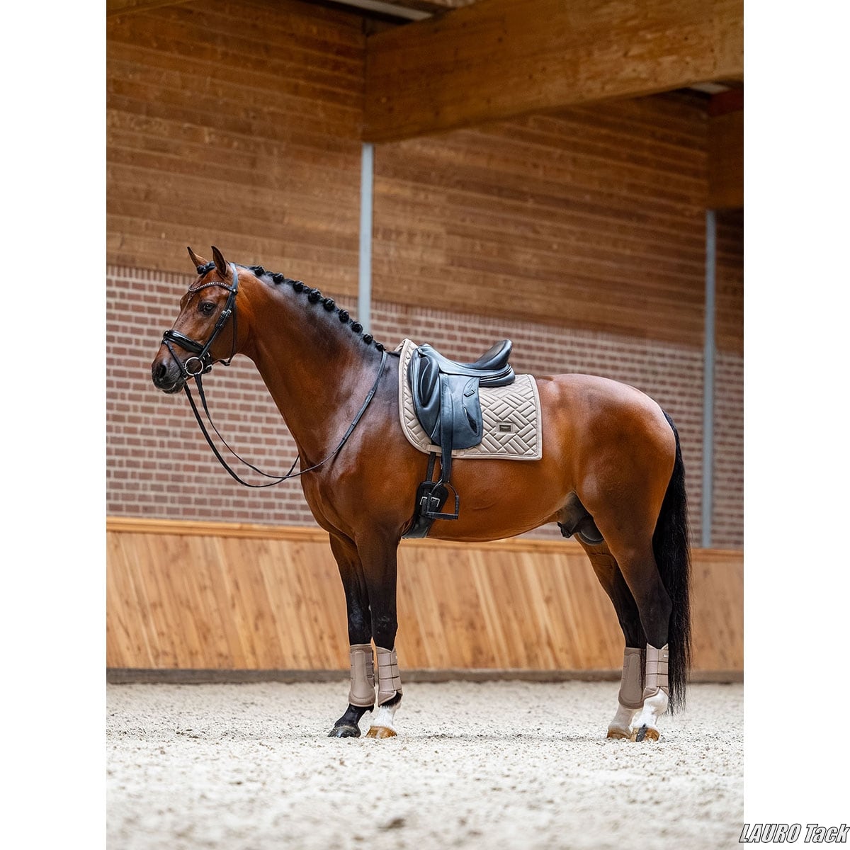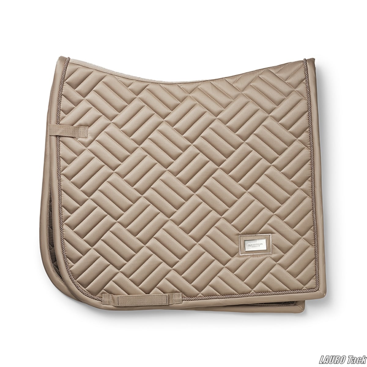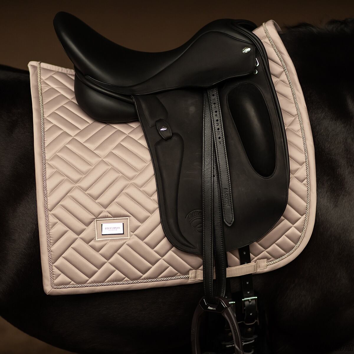 Equestrian StockholmのSandカラーの馬場用ゼッケン。速乾性と通気性に優れた裏地を使用し、抗菌性と温度調整機能を備えています。背中に自然に沿う形状でフィット感が高く、安定した装着感を実現。クラシックなステッチとシルバーのディテールが落ち着いた上品さを引き立てます。