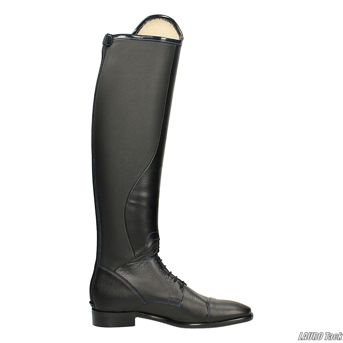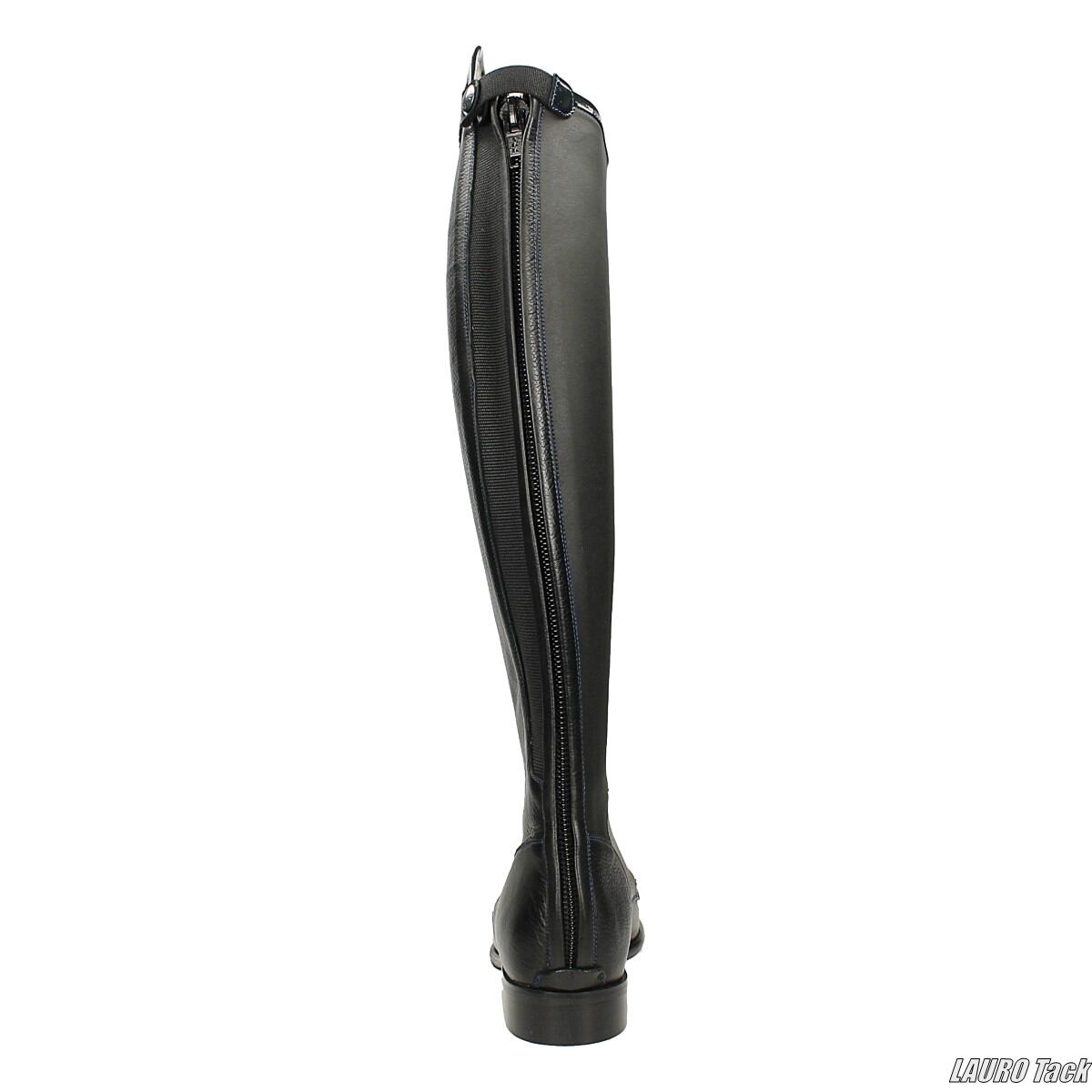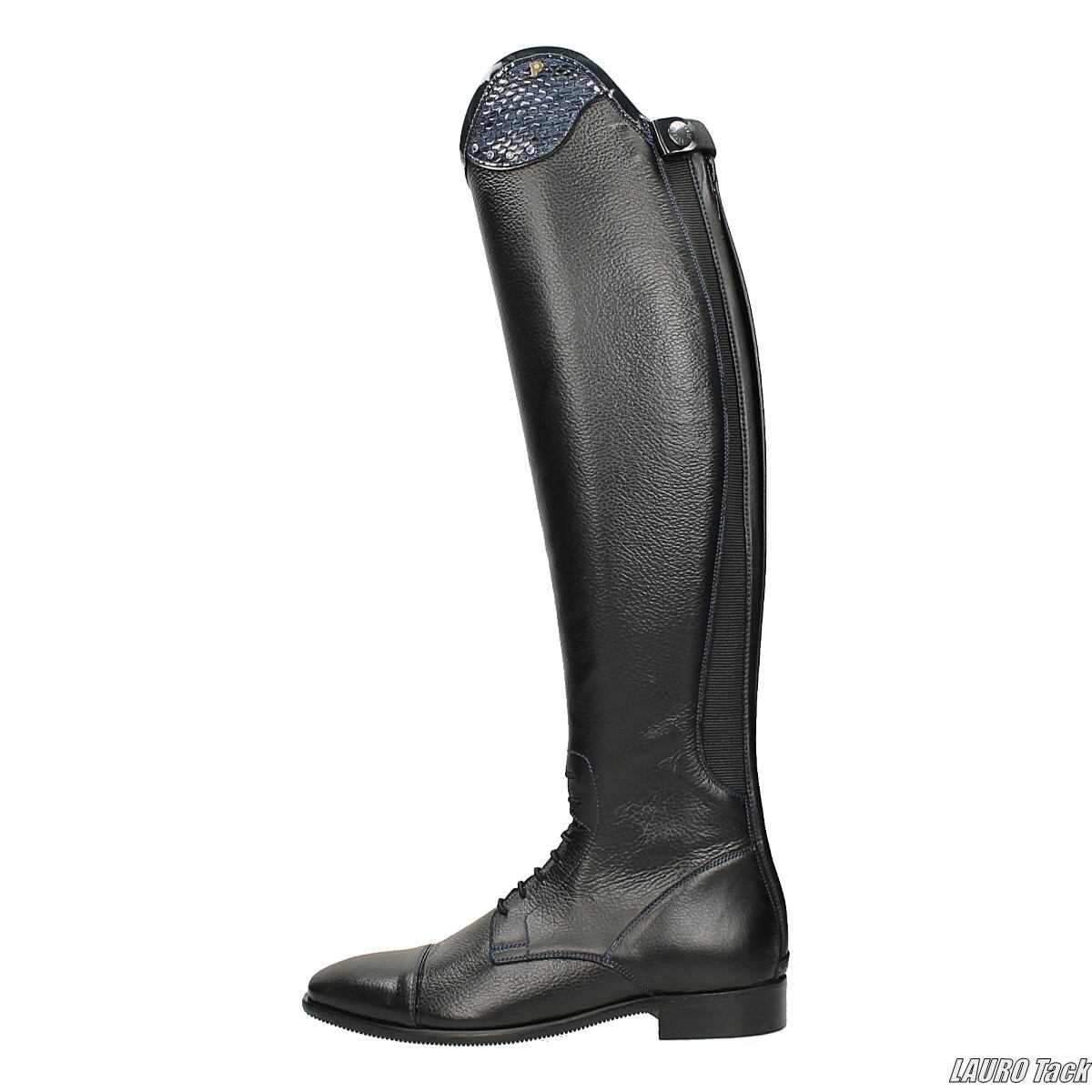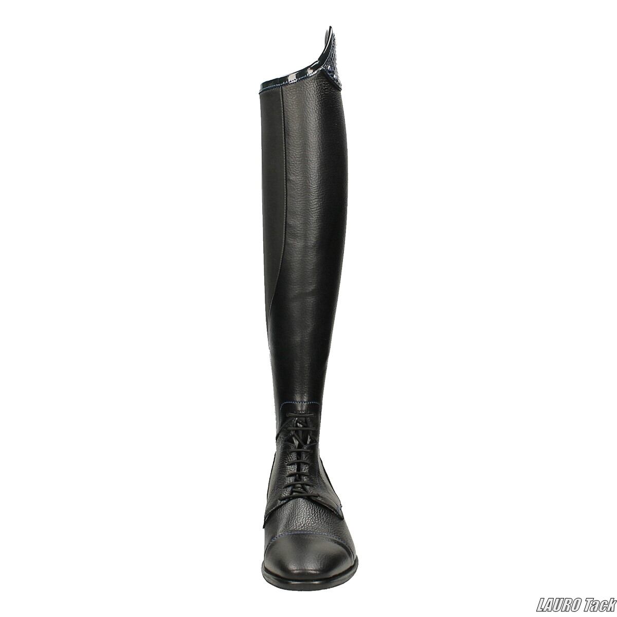 非常に柔らかく上質な型押し牛革を使用した、洗練された印象のライディングブーツです。前面にはシューレース、背面にはソールまで続くファスナーを備え、すっきりとしたシルエットと高い実用性を兼ね備えています。内側は革張りで、足にしなやかに馴染みます。高さ約5cmのブーツトップにはブラックのハニカム調エナメルプリントと同系色のストーン装飾を施し、控えめながら個性のあるデザインです。足首まわりは細身に設計され、ふくらはぎ部分には伸縮性素材を配置することで安定したフィット感を実現しています。ラバー製の滑りにくいソールと快適なフットベッドを備え、複数のふくらはぎサイズ展開から自分に合ったサイズを選ぶことができます。なお、専用ケア用品以外のワックスやクリームは使用できません。