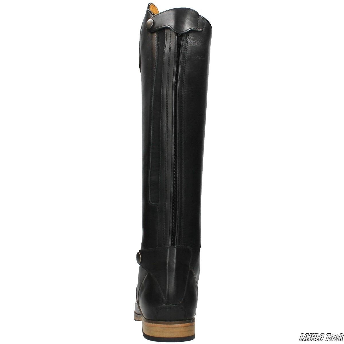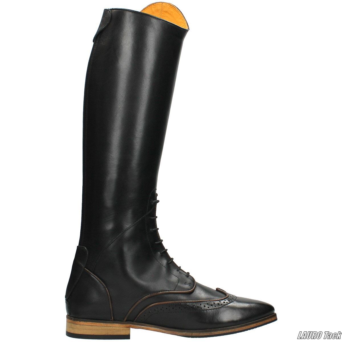 クラシックで上品なデザインのライディングブーツです。柔らかくしなやかな牛革を使用し、内側は革張りで快適な履き心地です。後部にはソールまで続くファスナーとスナップ留めのフラップを備えています。ふくらはぎ部分には伸縮性素材を配置し、脚に自然にフィットします。前面には伸縮性のあるシューレースを配置しています。滑りにくいラバーソールには木目調のデザインを取り入れ、ブラウンのパイピングやつま先のディテールが落ち着いたアクセントになっています。クッション性のあるインソールで、安定した履き心地を提供します。