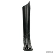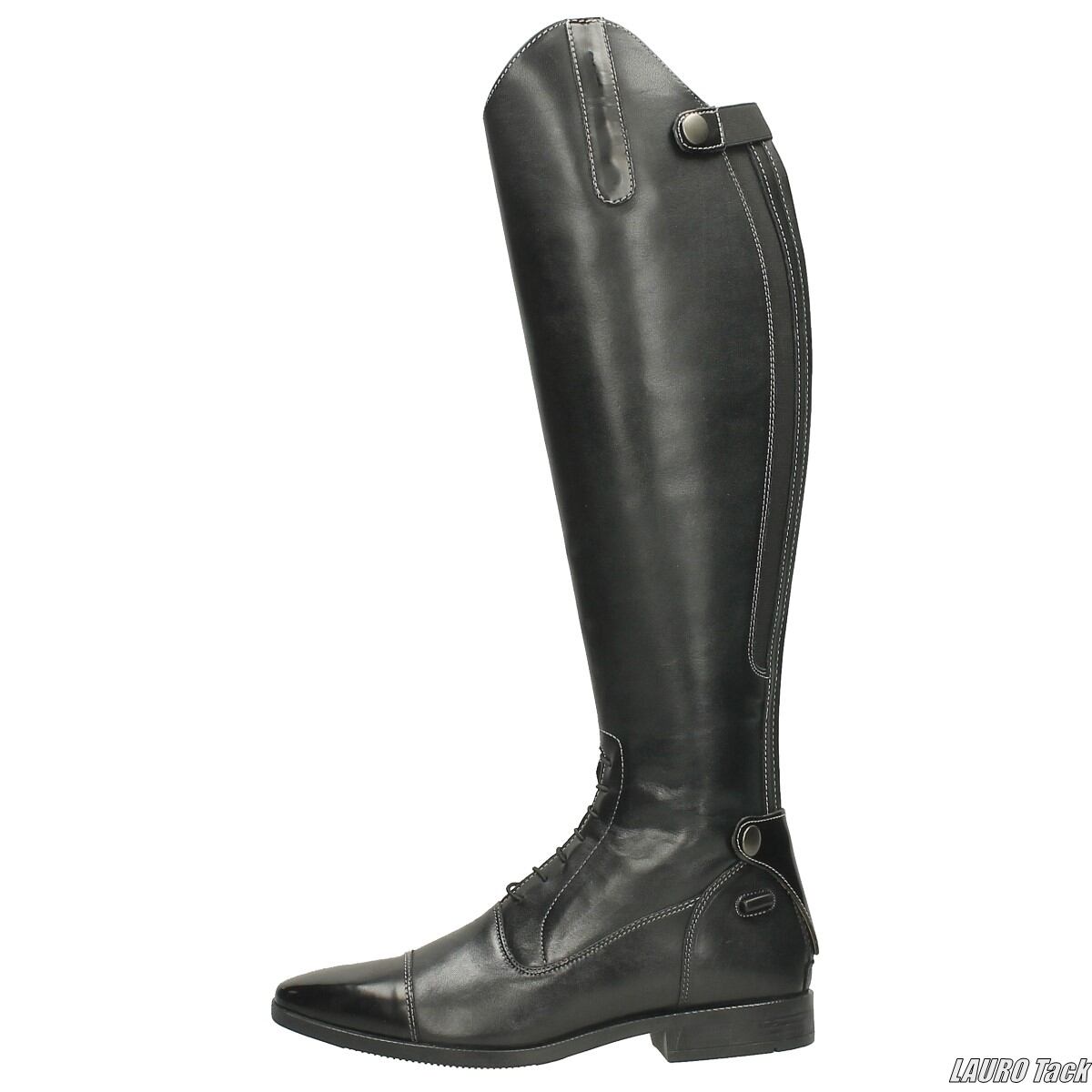 上品な佇まいのライディングブーツです。柔らかくしなやかな牛革を使用し、内側は革張りで快適な履き心地に仕上げています。後部にはソールまで続くファスナーとスナップ留めのフラップを備えています。ふくらはぎ部分には伸縮性素材を配置し、脚に沿った自然なフィット感を実現しています。前面には伸縮性のあるシューレースを配置しています。滑りにくいラバーソールと快適なインソールを備え、コントラストステッチやパイピング、エナメル調のディテールが上品な印象を引き立てています。