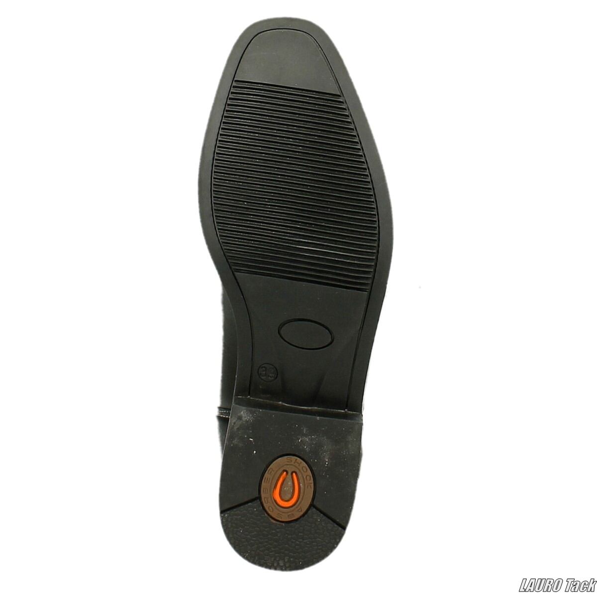 クラシックな雰囲気と実用性を兼ね備えたライディングブーツです。柔らかくしなやかな牛革を使用し、内側は革張りで快適な履き心地です。後部にはソールまで続くファスナーとスナップ留めのフラップを備えています。ふくらはぎ部分には伸縮性素材を配置し、脚に沿った安定したフィット感を実現しています。前面には伸縮性のあるシューレースを配置しています。滑りにくいラバーソールとクッション性のあるインソールを備え、コントラストステッチやパイピング、エナメル調ディテールが洗練された印象を与えます。
