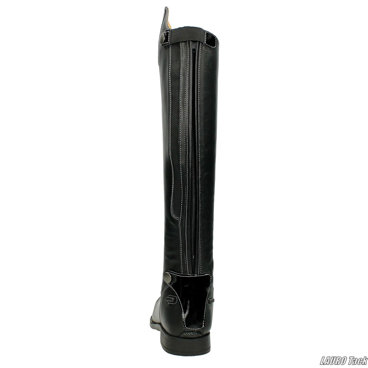 上品で洗練された印象のライディングブーツです。柔らかくしなやかな牛革を使用し、内側は革張りで足当たりにも配慮されています。後部にはソールまで続くファスナーとスナップ留め付きフラップを備えています。ふくらはぎ部分には伸縮性素材を配置し、脚に自然に沿うフィット感を実現しています。前面には伸縮性のあるシューレースを配置しています。滑りにくいラバーソールと快適なインソールを備え、コントラストステッチやパイピング、エナメル調ディテールが全体を上品にまとめています。