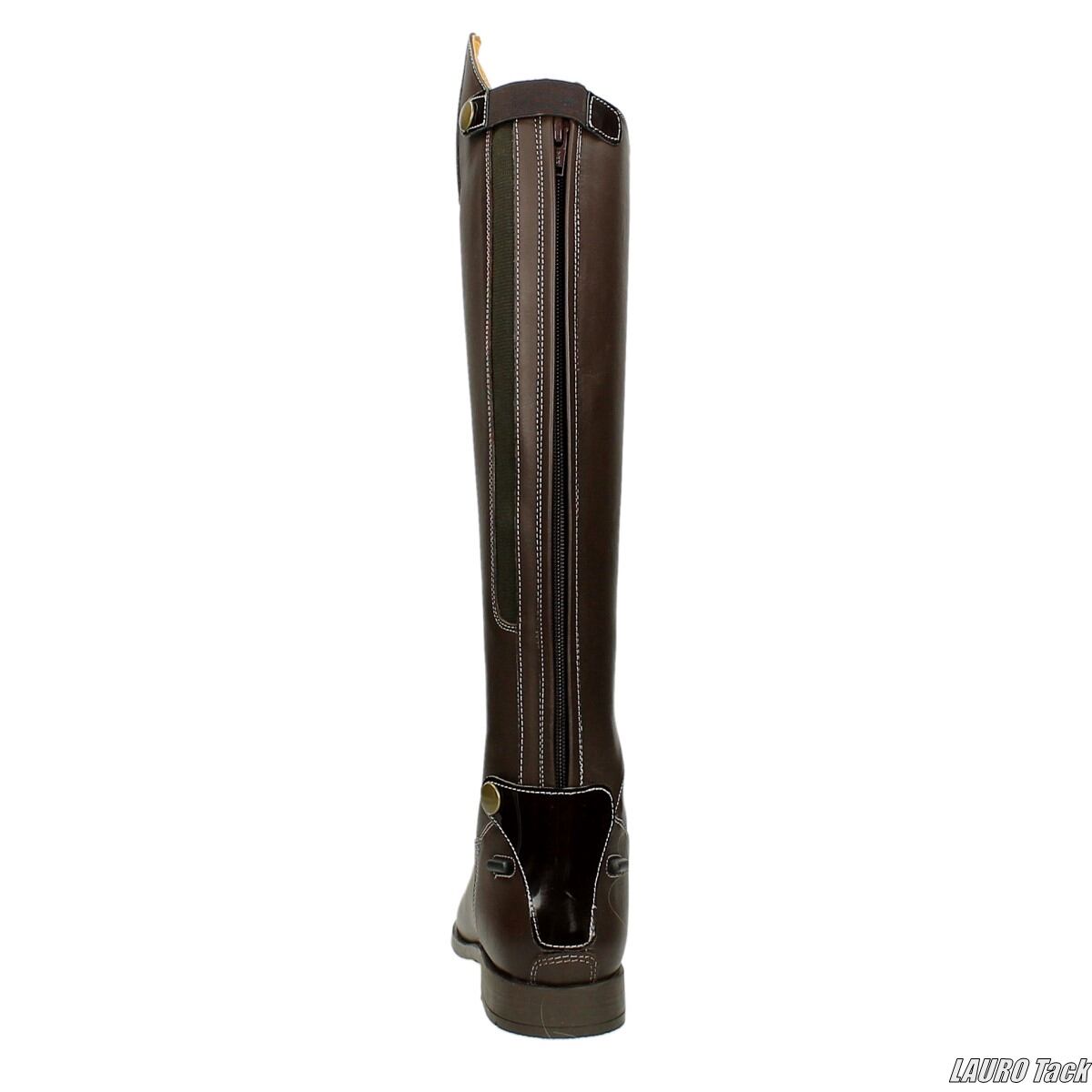 落ち着いた色合いが魅力のライディングブーツです。柔らかくしなやかな牛革を使用し、内側は革張りで快適な履き心地です。後部にはソールまで続くファスナーとスナップ留め付きフラップを備え、着脱しやすい仕様です。ふくらはぎ部分には伸縮性素材を配置し、自然なフィット感を実現しています。前面には伸縮性のあるシューレースを備えています。滑りにくいラバーソールとクッション性のあるインソールを備え、パイピングやエナメル調ディテールが上品な印象を引き立てます。