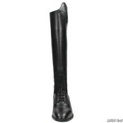 非常にエレガントな印象のライディングブーツです。柔らかくしなやかなヨーロッパ産牛革を使用し、内側は革張りで足に心地よく馴染みます。前面にはヌバック調素材のアクセントを施したシューレースを備え、ブーツトップにも同素材のディテールを取り入れています。後部にはソールまで続くファスナーとスナップ留め付きファスナーガードを配置しています。ふくらはぎ部分には伸縮性素材を備え、安定したフィット感を実現しています。衝撃を和らげるラバーソールと快適なフットベッドを備えています。