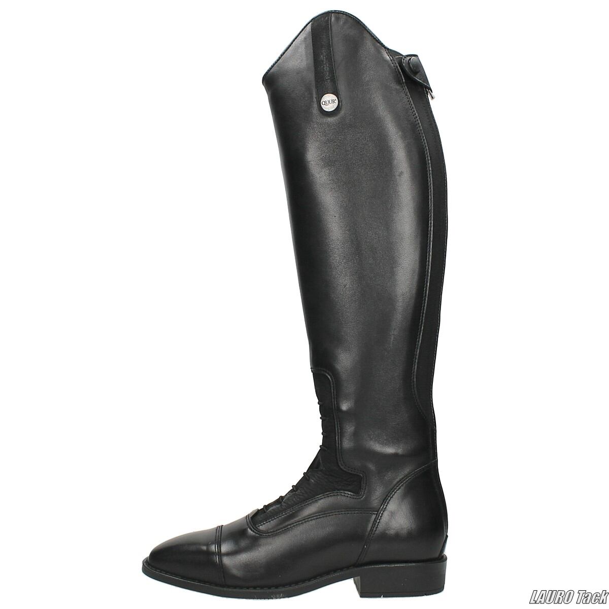 非常にエレガントな印象のライディングブーツです。柔らかくしなやかなヨーロッパ産牛革を使用し、内側は革張りで足に心地よく馴染みます。前面にはヌバック調素材のアクセントを施したシューレースを備え、ブーツトップにも同素材のディテールを取り入れています。後部にはソールまで続くファスナーとスナップ留め付きファスナーガードを配置しています。ふくらはぎ部分には伸縮性素材を備え、安定したフィット感を実現しています。衝撃を和らげるラバーソールと快適なフットベッドを備えています。