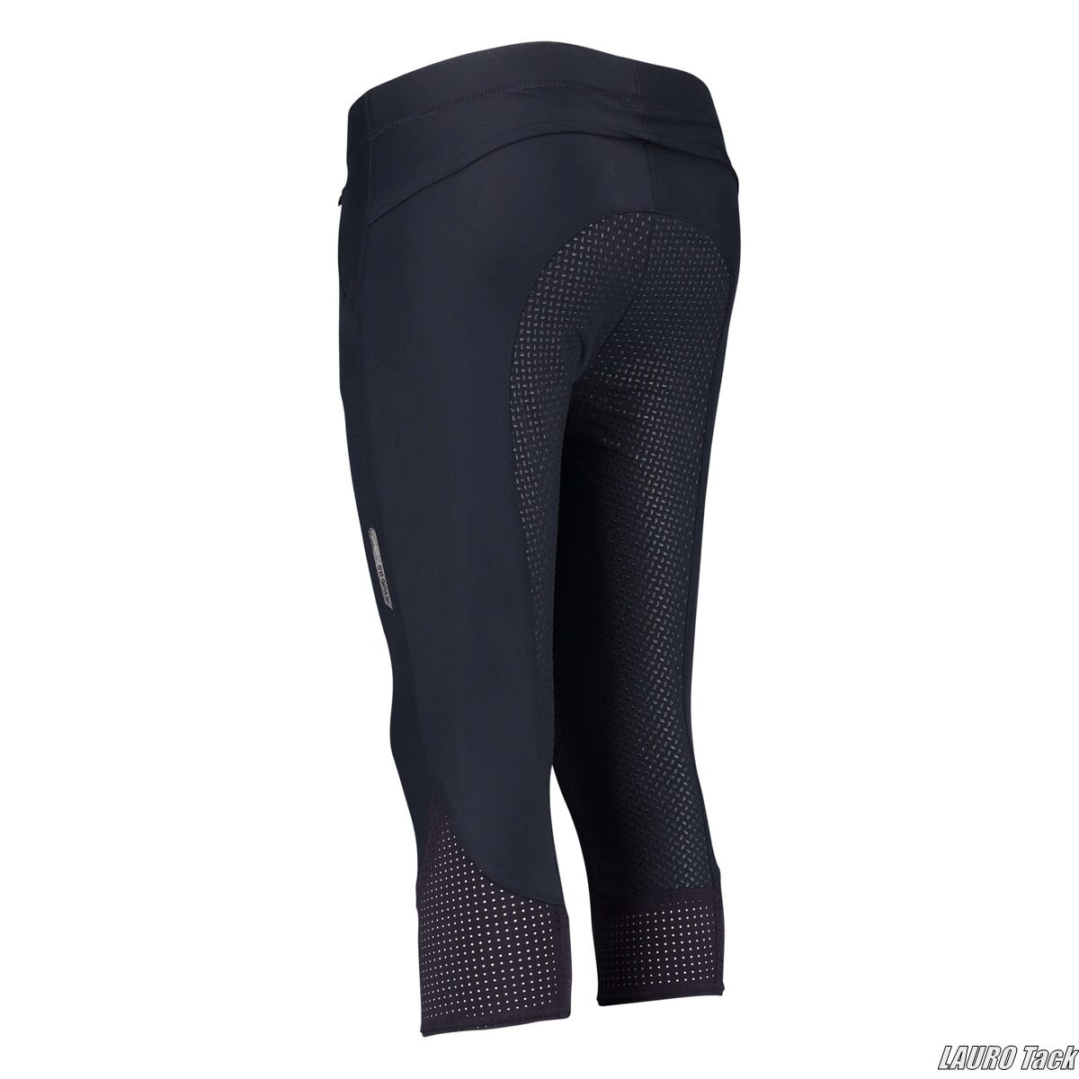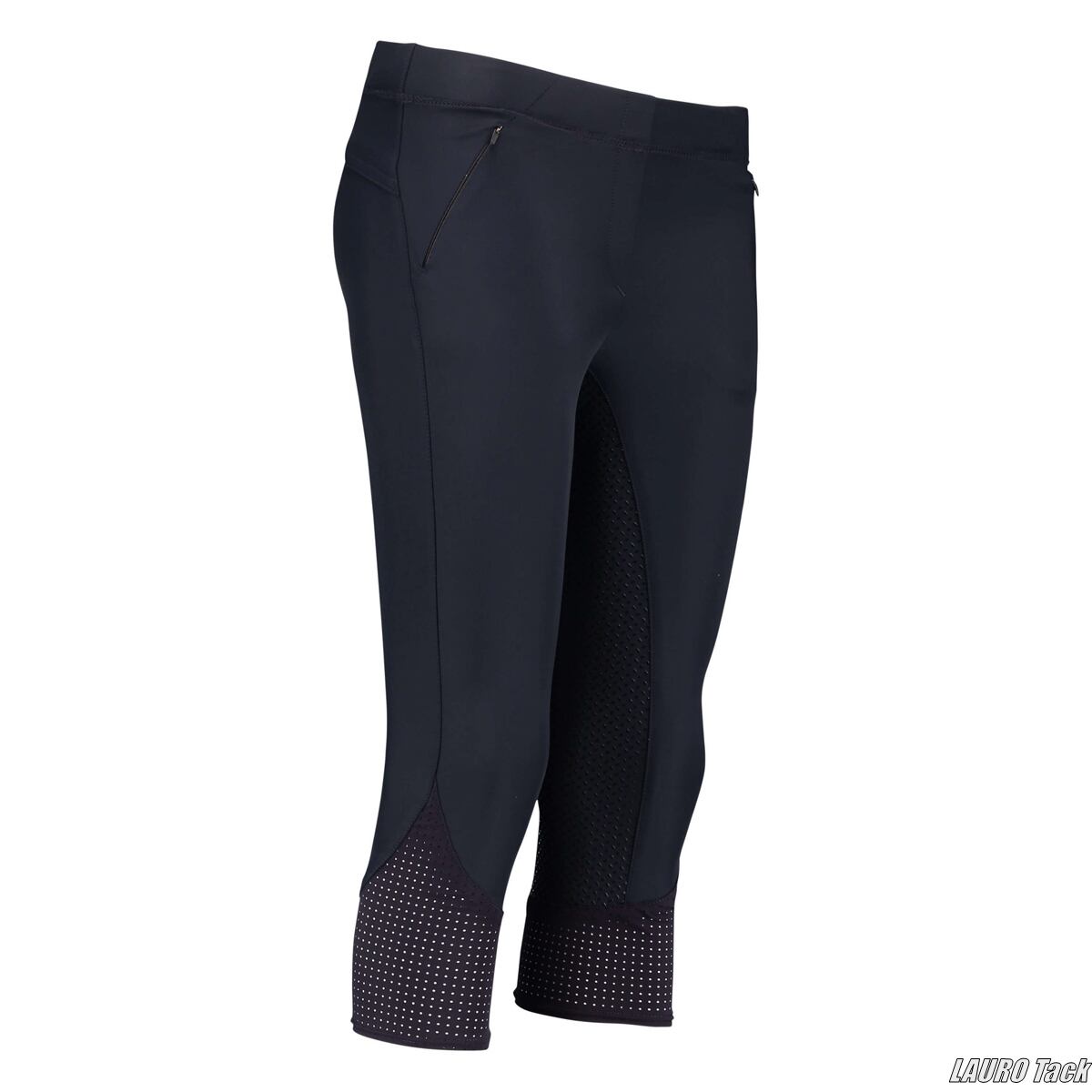 スポーティーな3/4丈ライディングタイツです。フルシリコン仕様のグリップが安定した騎乗をサポートします。伸縮性のある素材を使用し、動きやすく快適なフィット感を実現しています。脚部には通気性を高めるメッシュ素材を採用し、暑い時期でも快適に着用できます。フロントには目立ちにくいジッパーポケットを備えています。