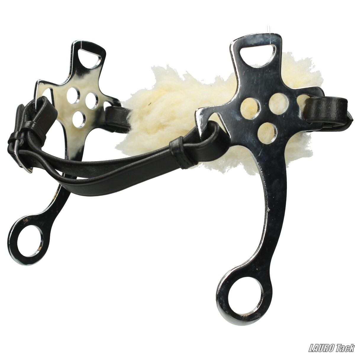 ハミを使わず、鼻まわりに装着して操作するタイプの頭絡です。ショートタイプのステンレス製サイドパーツを備え、幅広で調整可能な設計。ノーズバンド内側には柔らかなウール素材を使用し、馬への当たりを和らげています。口元にトラブルがある馬や、ハミの刺激を避けたい場合でも騎乗が可能です。