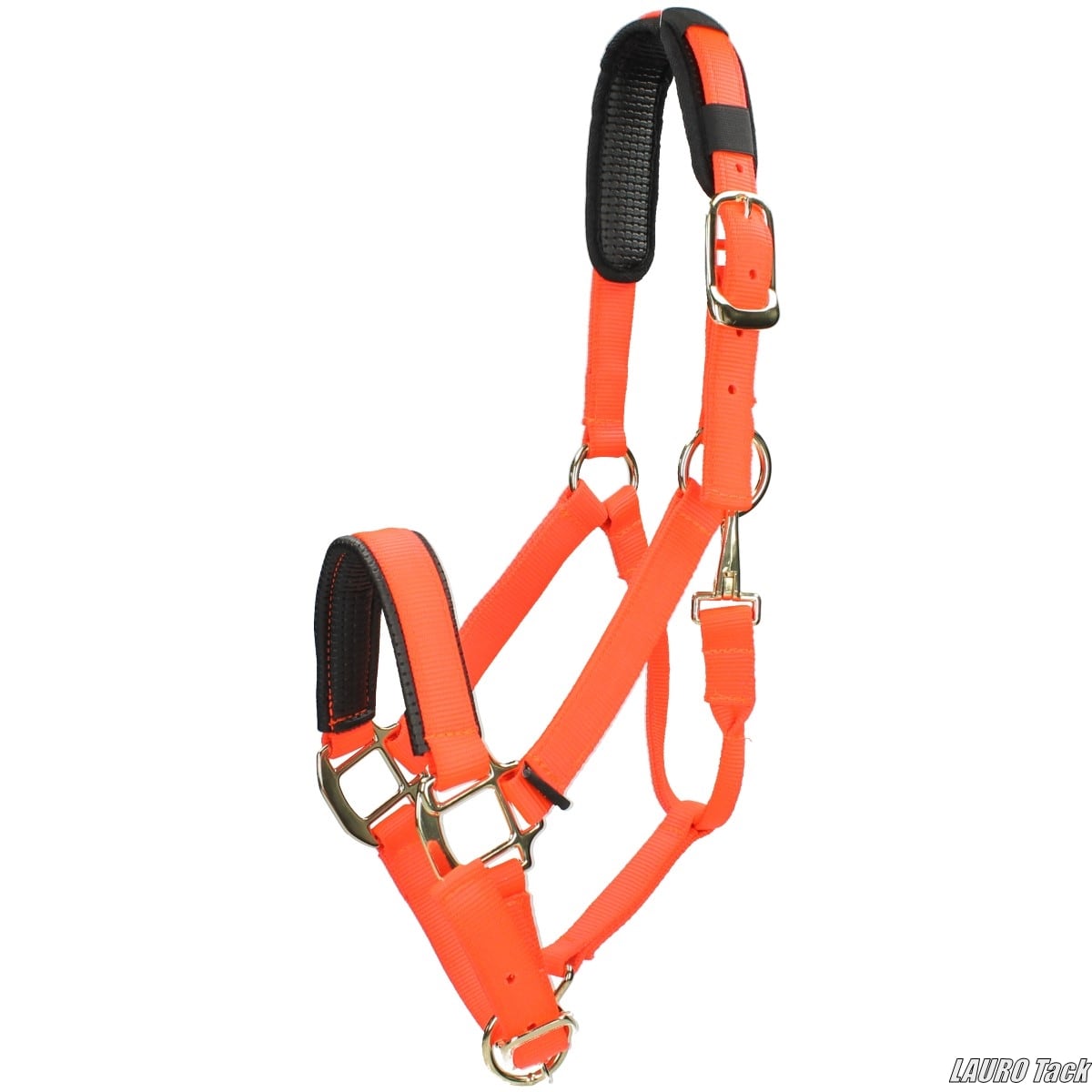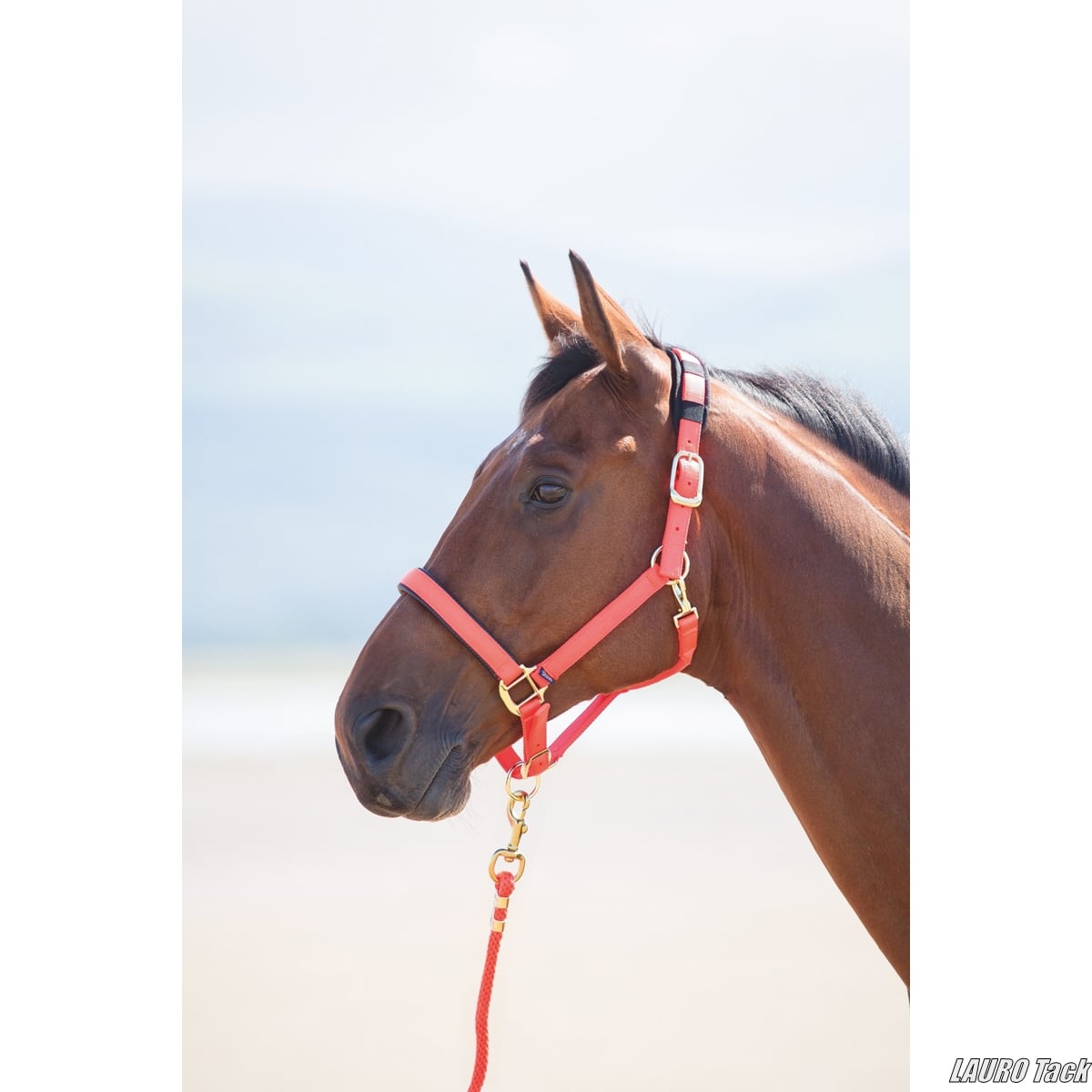 丈夫で見た目にも上品なナイロン素材を使用した無口です。頭の上に当たる部分には取り外し可能なやわらかいパッド付きで、長時間の装着でも負担を抑えます。鼻まわりにもクッションが入っており、敏感な馬にも配慮されたつくり。2か所でサイズ調整ができ、あご下はスナップ金具で着脱が簡単です。ゴールドカラーの金具が全体を引き締めます。