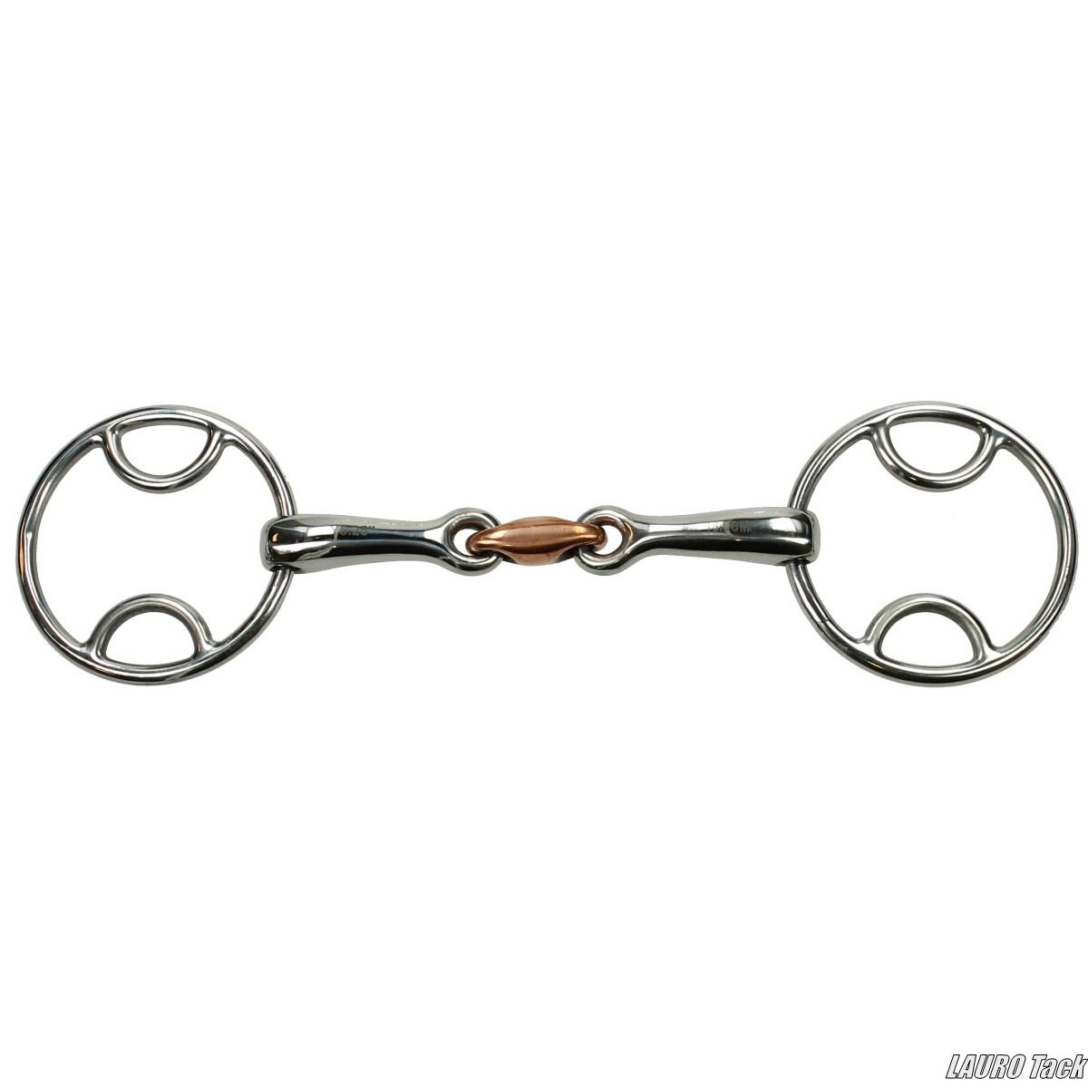 馬の口の中に入れる「はみ」の一種で、左右が独立して動く二重構造のタイプです。口の中に当たる中央部分には銅素材を使用しており、馬が甘みを感じやすく、よだれが出やすくなることで口をやわらかく使いやすくなります。口の中の圧が一点に集中しにくく、全体に分散される設計。複数のリング構造により、装着位置によって作用の強さを調整でき、通常のはみよりやや強めに働きますが、別の強作用タイプと比べると比較的穏やかです。厚みは18mmで、馬場競技では使用できません。