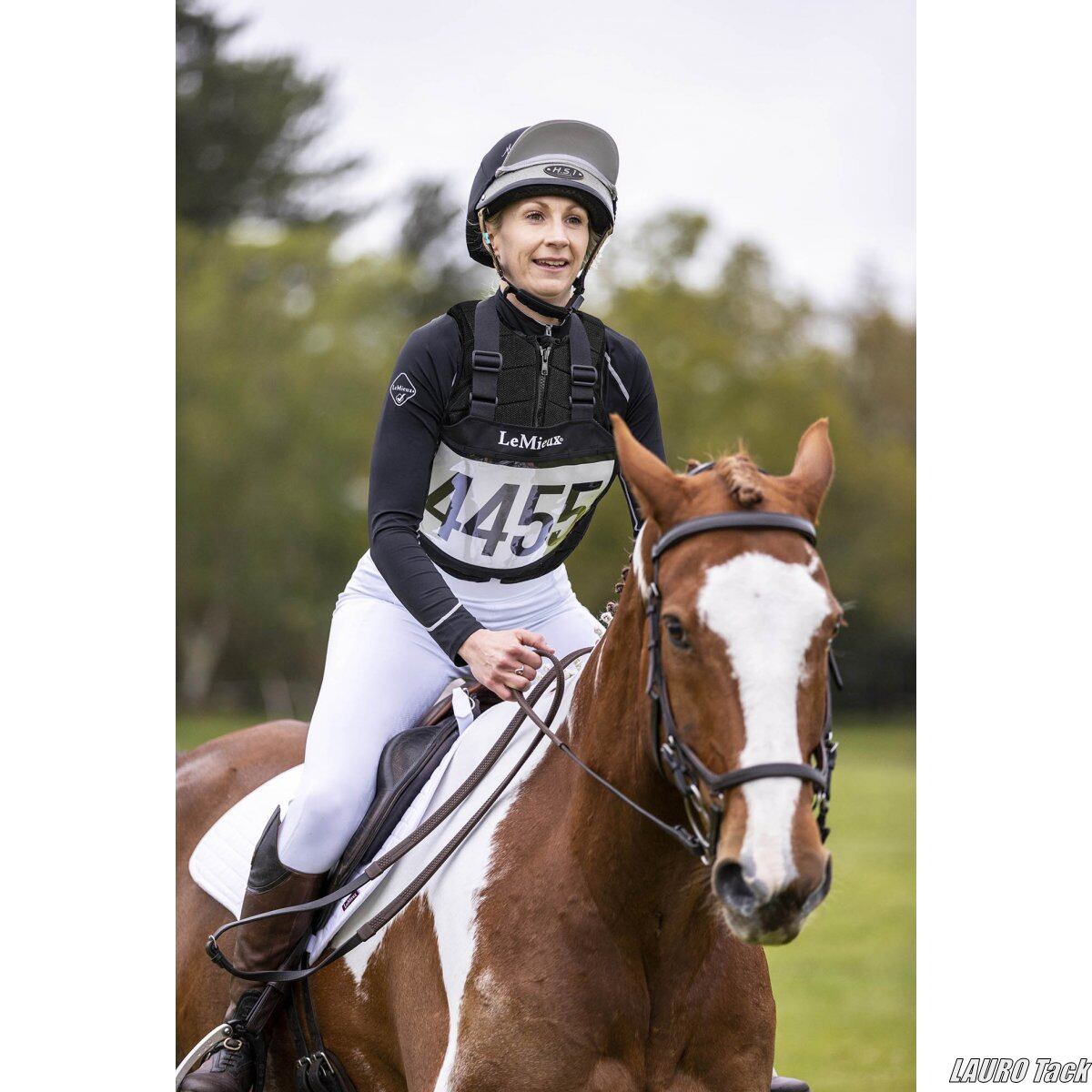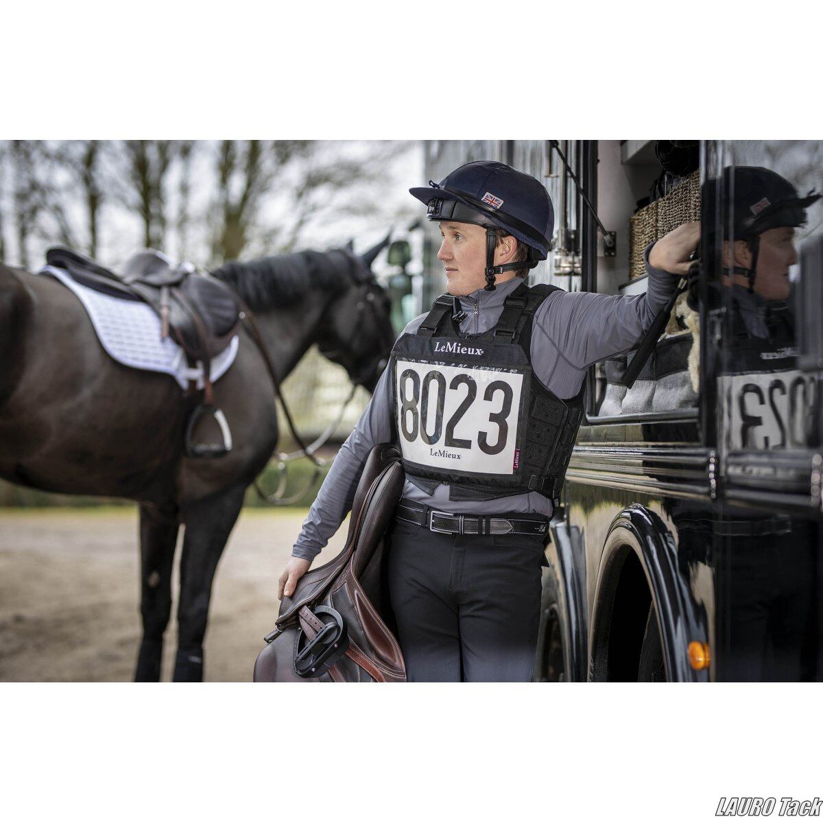 LeMieuxの総合馬術用ナンバーホルダー。肩とサイドでサイズ調整可能。前後透明ポケット仕様で、番号は付属しません。