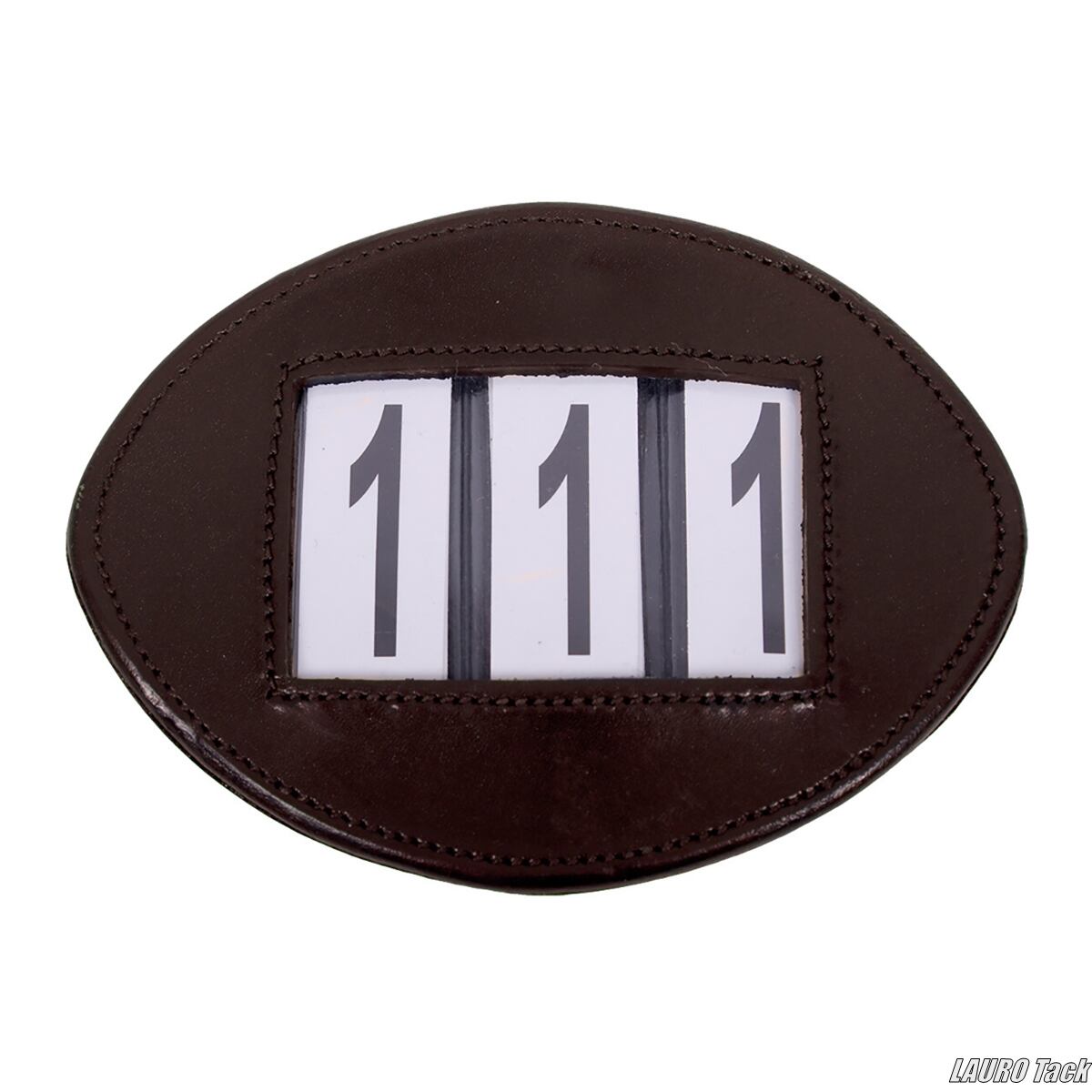 QHPのベーシックなレザー製ナンバーホルダー。面ファスナーまたは安全ピンで装着可能。楕円形デザインで、差し替え式3桁番号付き。2個セット。サイズ12×9cm。