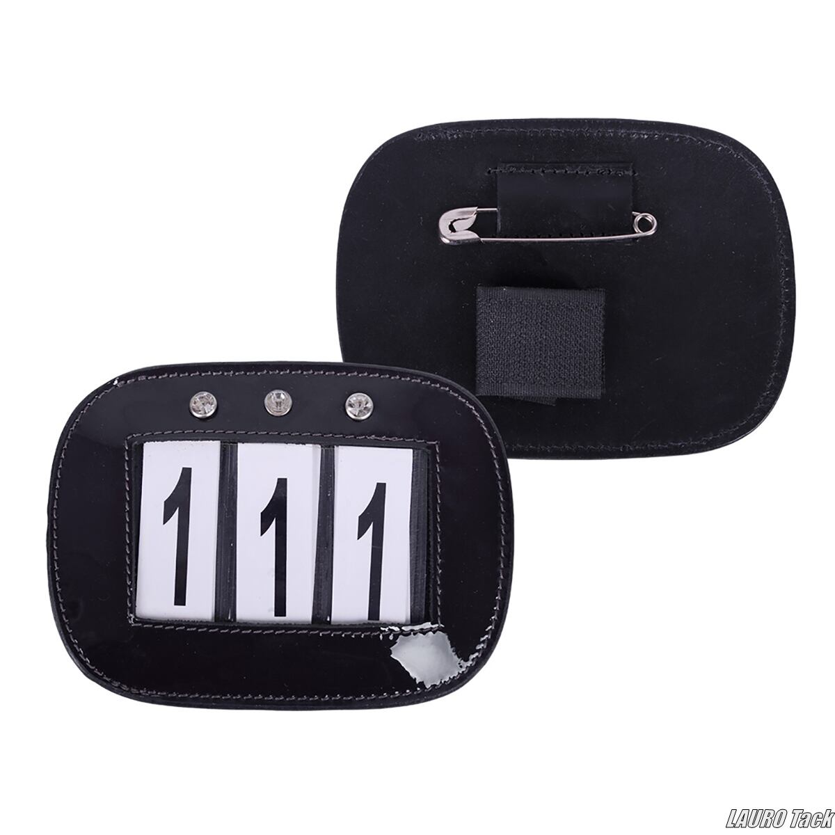 QHPのエナメル調ナンバーホルダー。面ファスナーまたは安全ピンで装着可能。3つのラインストーン装飾付き。差し替え式番号入り、2個セット。サイズ11×8cm。