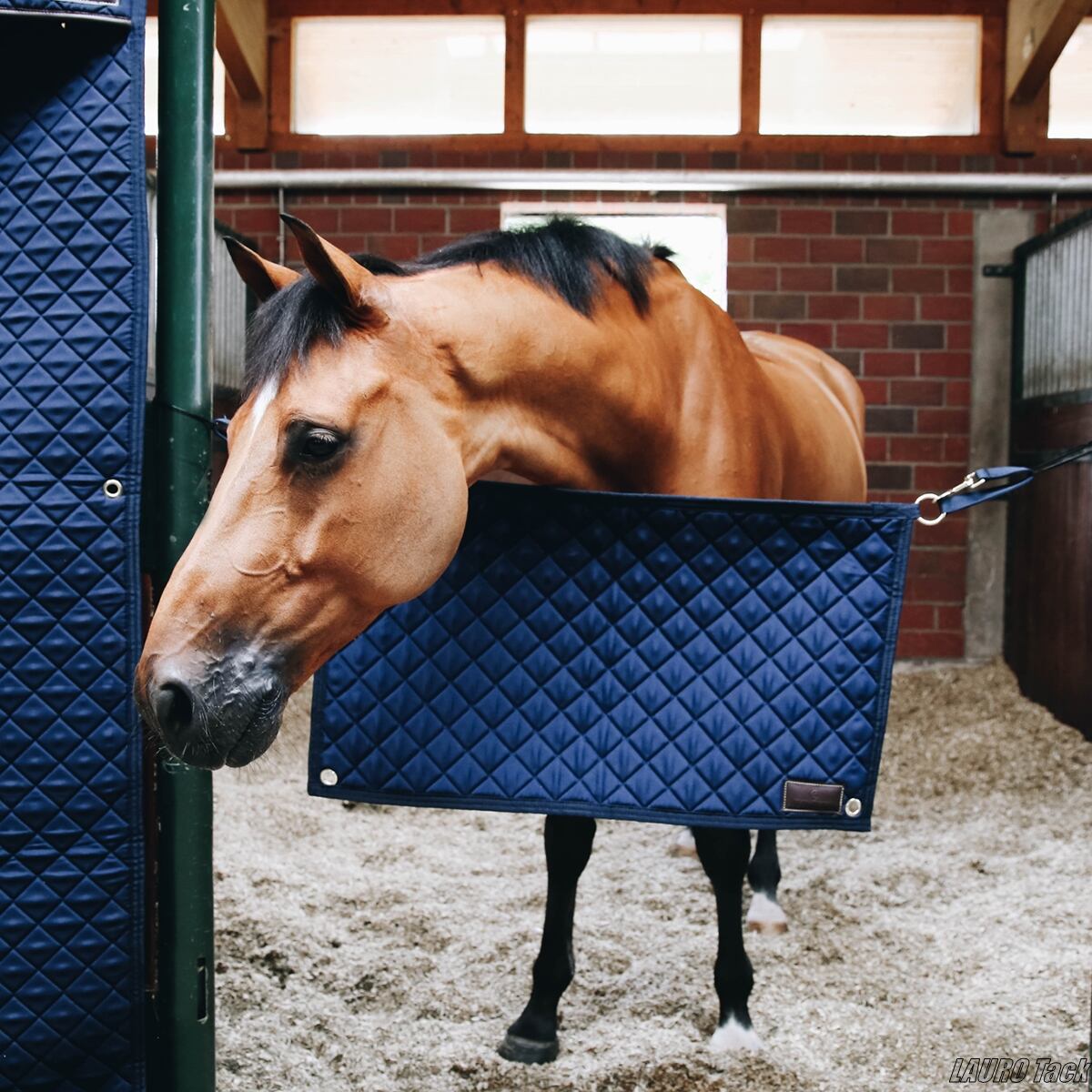 Kentuckyの美しいステーブルガード。耐久性に優れた600Dハイテナシティポリエステル製で、馬が馬房から頭を出せる設計です。丈夫なリング4個付き。高級感のあるチェック柄デザインにKentuckyロゴ入り。サイズ92×53cm。30℃で洗濯可能、乾燥機不可。