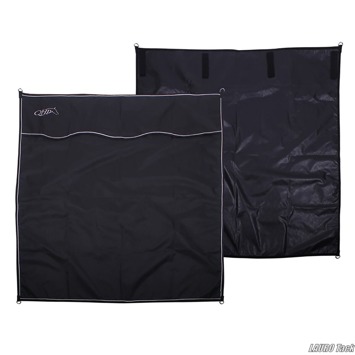 馬房壁に取り付けるステーブルカーテン。競技会などで馬やポニーにより静かな環境を提供します。上部に面ファスナーストラップ4本、四隅にDリング付き。フロントに白い装飾コードをあしらい、左上にQHPロゴ入り。防水素材使用。サイズ180×170cm。ポリエステルおよびナイロン製。