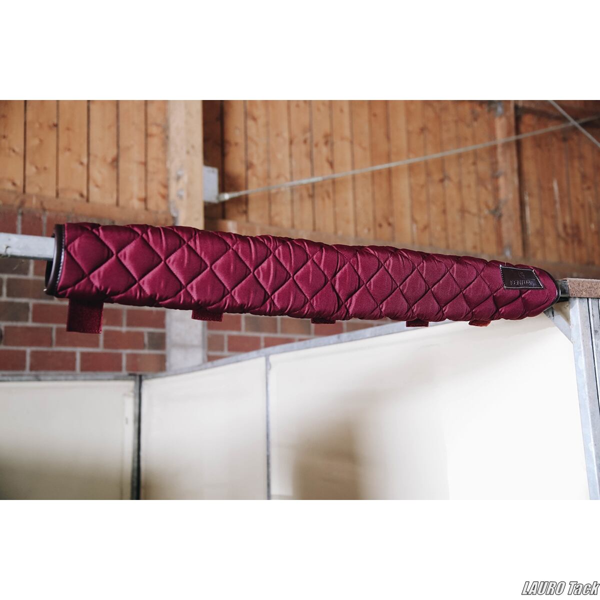 Kentuckyの実用的な馬房ドア用ヘッドプロテクター。耐久性に優れた600Dハイテナシティポリエステル製。スタイリッシュなダイヤモンドキルティング仕上げ。強力な面ファスナー5本で簡単に装着可能。ブラウンの人工レザーディテールとKentuckyロゴ付き。Kentuckyのステーブルカーテンやステーブルガードと統一感のあるデザイン。