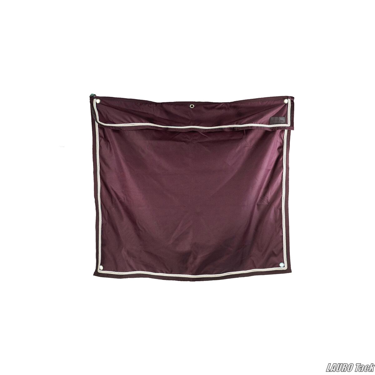 Kentucky Classicコレクションのショートタイプステーブルカーテン。1680D防水生地を使用し、軽量で設置も簡単。面ファスナー固定でロールアップ可能。水を吸収せず色あせしにくい素材。Kentuckyロゴ入り。ダークレッドはゴールドカラーの装飾コード仕様。サイズ135×125cm。30℃洗濯可、乾燥機不可。