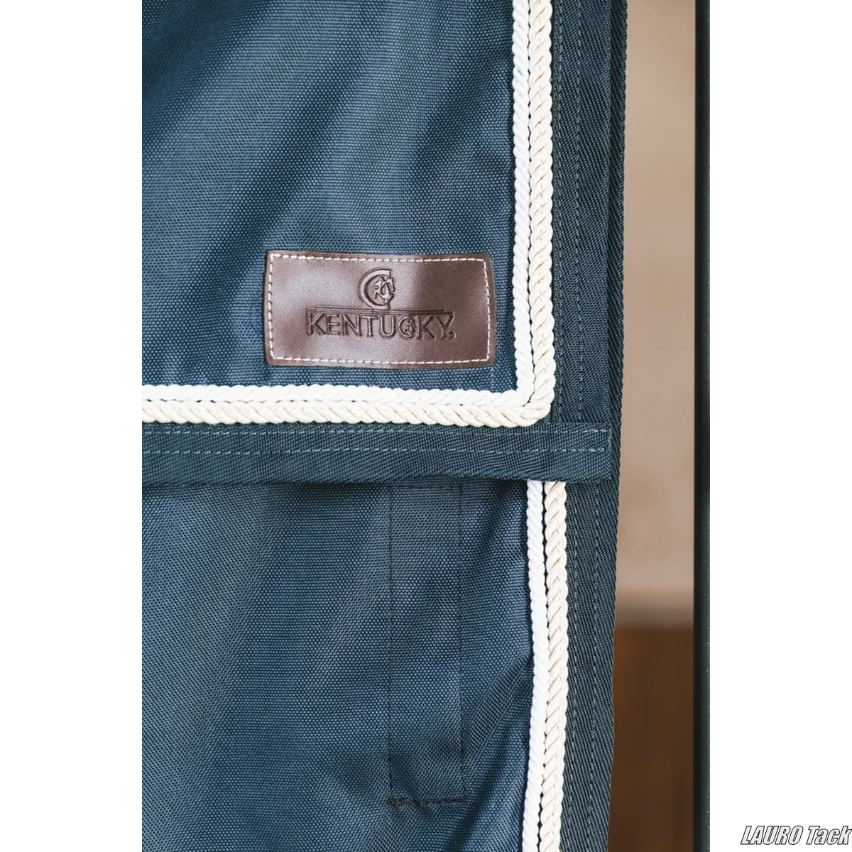 Kentucky Classicコレクションのロングタイプステーブルカーテン。1680D防水生地製で軽量かつ丈夫。ロールアップ可能で設置も簡単。水を吸収せず色あせしにくい素材。Kentuckyロゴ入り。ダークブルーはシルバーカラーの装飾コード仕様。サイズ135×200cm。30℃洗濯可、乾燥機不可。