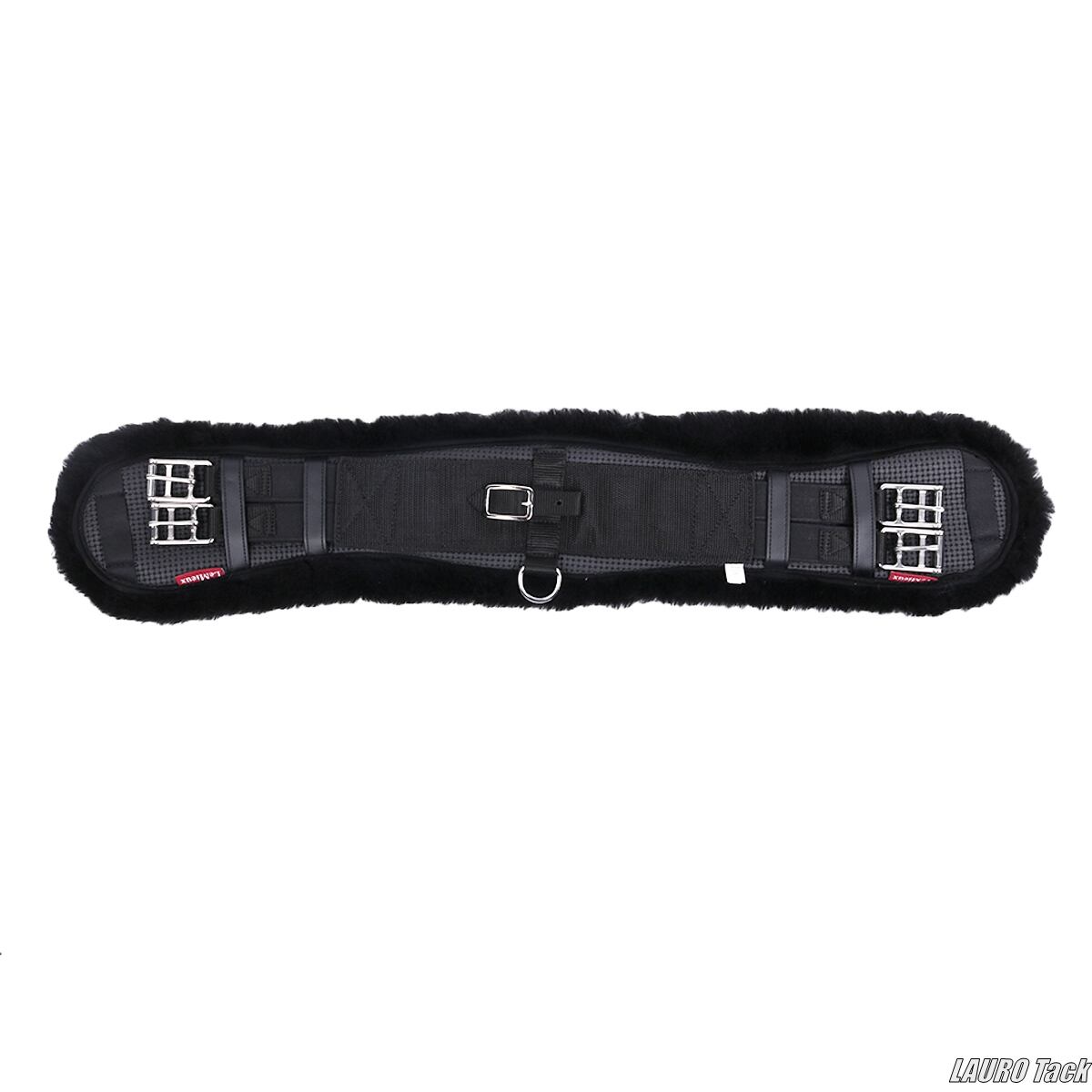 LeMieuxの成形された馬場鞍用腹帯です。内側は柔らかいフリースで全面裏地付きです。外側は丈夫な素材を使用しています。腹帯の端にややゴムが入っています。腹帯の圧力を嫌がる敏感な馬や腹帯による擦れや腫れが出やすい馬にも適しています。馬の動きを妨げにくいカーブ形状です。中央に補助手綱用の金属リングが付いています。バックル付きの取り外し可能な布リングが中央に付いています。ローラー付きバックルはステンレススチール製です。