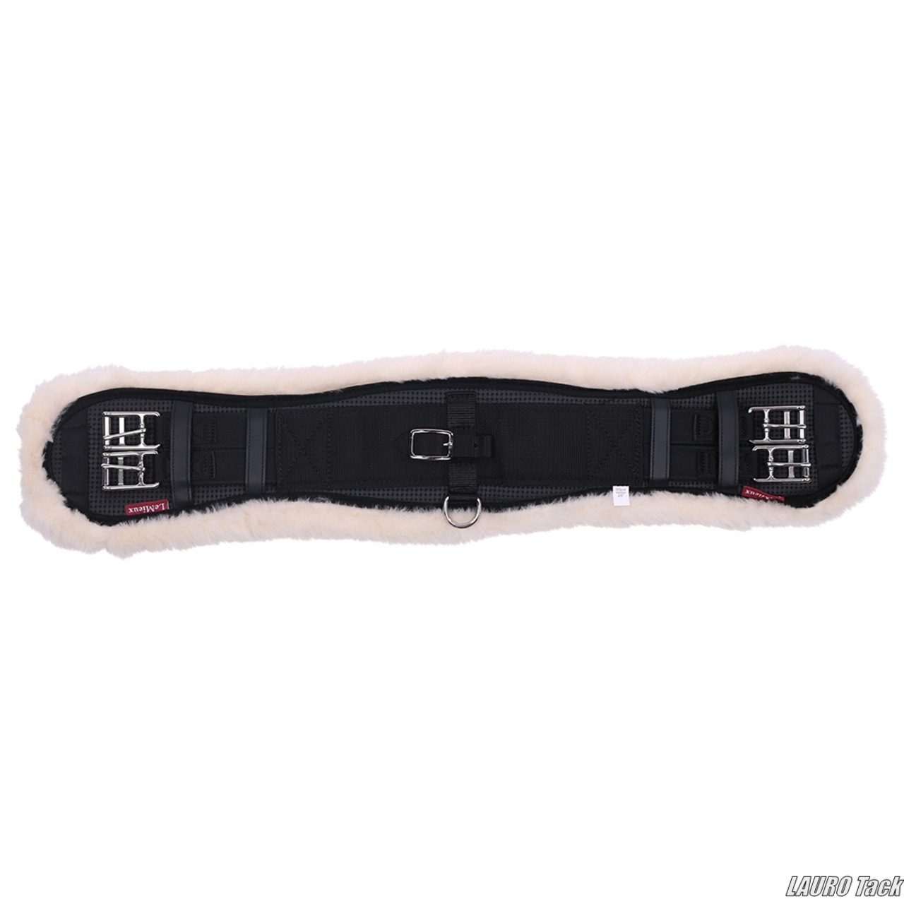 LeMieuxの成形された馬場鞍用腹帯です。内側は柔らかいフリースで全面裏地付きです。外側は丈夫な素材を使用しています。腹帯の端にややゴムが入っています。腹帯の圧力を嫌がる敏感な馬や腹帯による擦れや腫れが出やすい馬にも適しています。馬の動きを妨げにくいカーブ形状です。中央に補助手綱用の金属リングが付いています。バックル付きの取り外し可能な布リングが中央に付いています。ローラー付きバックルはステンレススチール製です。