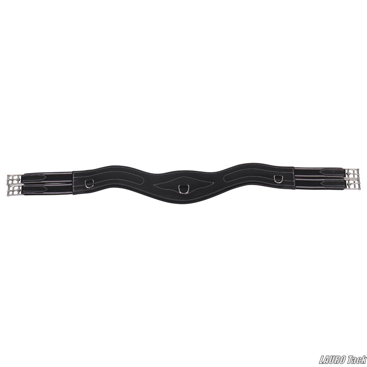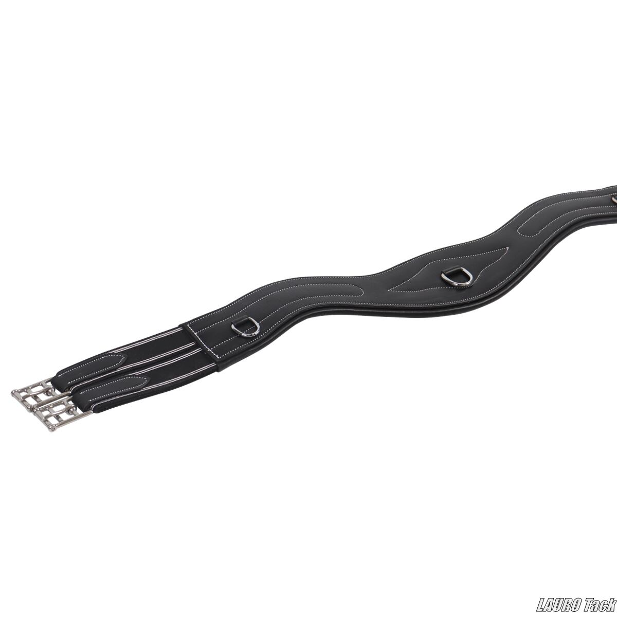 QHPのレザー製腹帯です。丈夫な牛革を使用しています。カーブ形状で馬の動きを妨げにくい設計です。内側は柔らかい牛革です。白いステッチが施されています。中央に1つ両側に2つのリングが付いています。両端にゴムが付いており腹帯を締めやすく快適です。ステンレススチール製ローラー付きバックルが付いています。素材は牛革です。