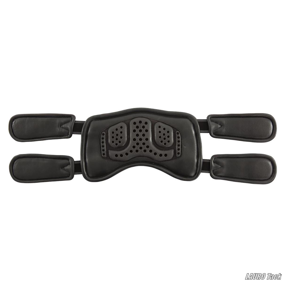 BRのレザー製馬場鞍用腹帯です。カーブ形状で馬の動きを妨げにくい設計です。ジェルパッドにより快適な装着感を保ちます。幅広のベリーガードが付いています。中央にDリングが付いています。腹帯革の間に余裕があり鞍の安定性を高めます。胸骨への圧力を軽減します。腹部の大きい馬には適していません。両側にゴムが付いています。エアフロージェルパッドが付いています。ステンレススチール製ローラー付きバックルが付いています。