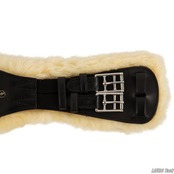 BRのレザー製馬場鞍用腹帯です。カーブ形状で馬の動きを妨げにくい設計です。メディカルシープスキンの柔らかい裏地が付いています。衛生的で汗に強く細菌の繁殖を抑えます。柔らかい裏地が圧力を均等に分散します。天然の羊毛が擦れや過熱を防ぎます。敏感な皮膚の馬にも適しています。両側にゴムが付いています。中央に補助手綱用のDリングが付いています。ステンレススチール製ローラー付きバックルが付いています。裏地は30℃で専用のシープスキン用洗剤を使用して洗うことができます。