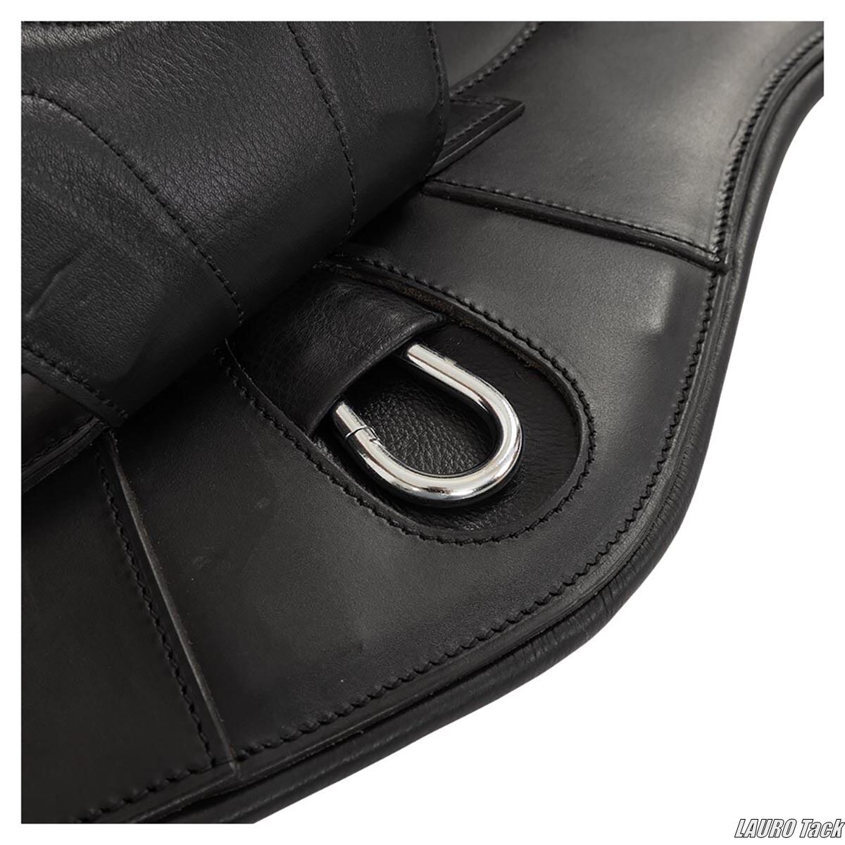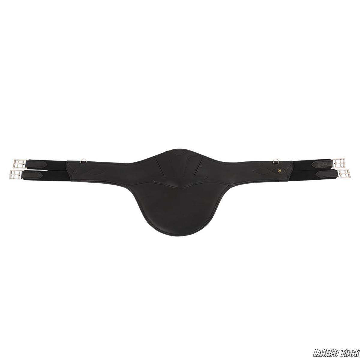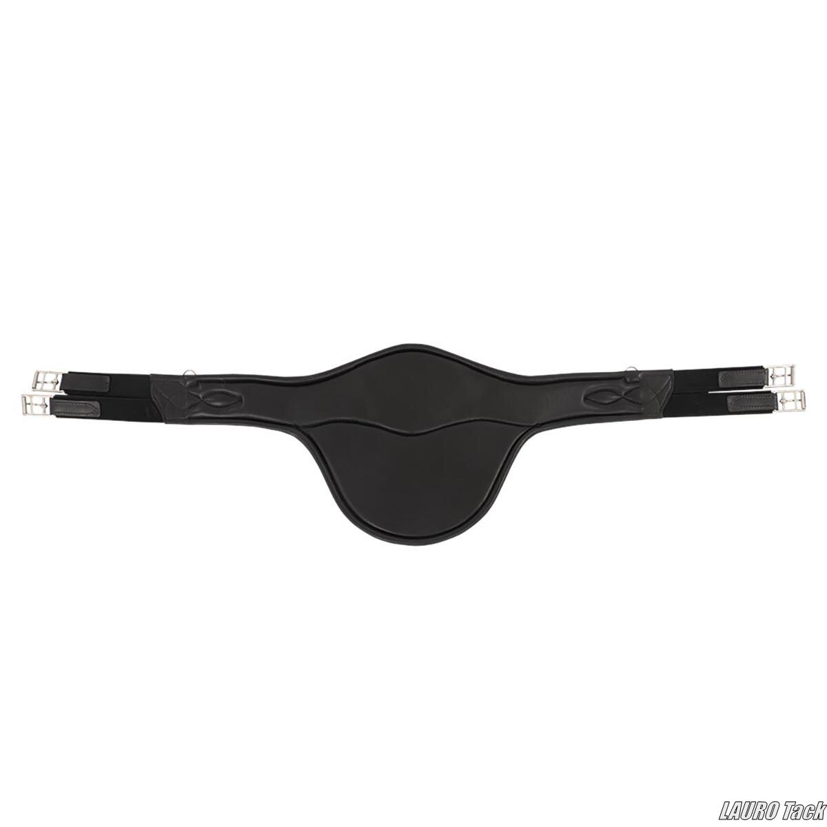 BRの障害用腹帯です。ジャンプ時に腹部を保護するベリーガードが付いています。丈夫な作りです。馬の動きを妨げにくい形状です。中央のフラップにカラビナフックが付いています。フラップは自動で閉じる構造です。両側にゴムが付いています。ステンレススチール製ローラー付きバックルが付いています。補助手綱などを取り付けるための小さなDリングが2つ付いています。装飾ステッチが施されています。