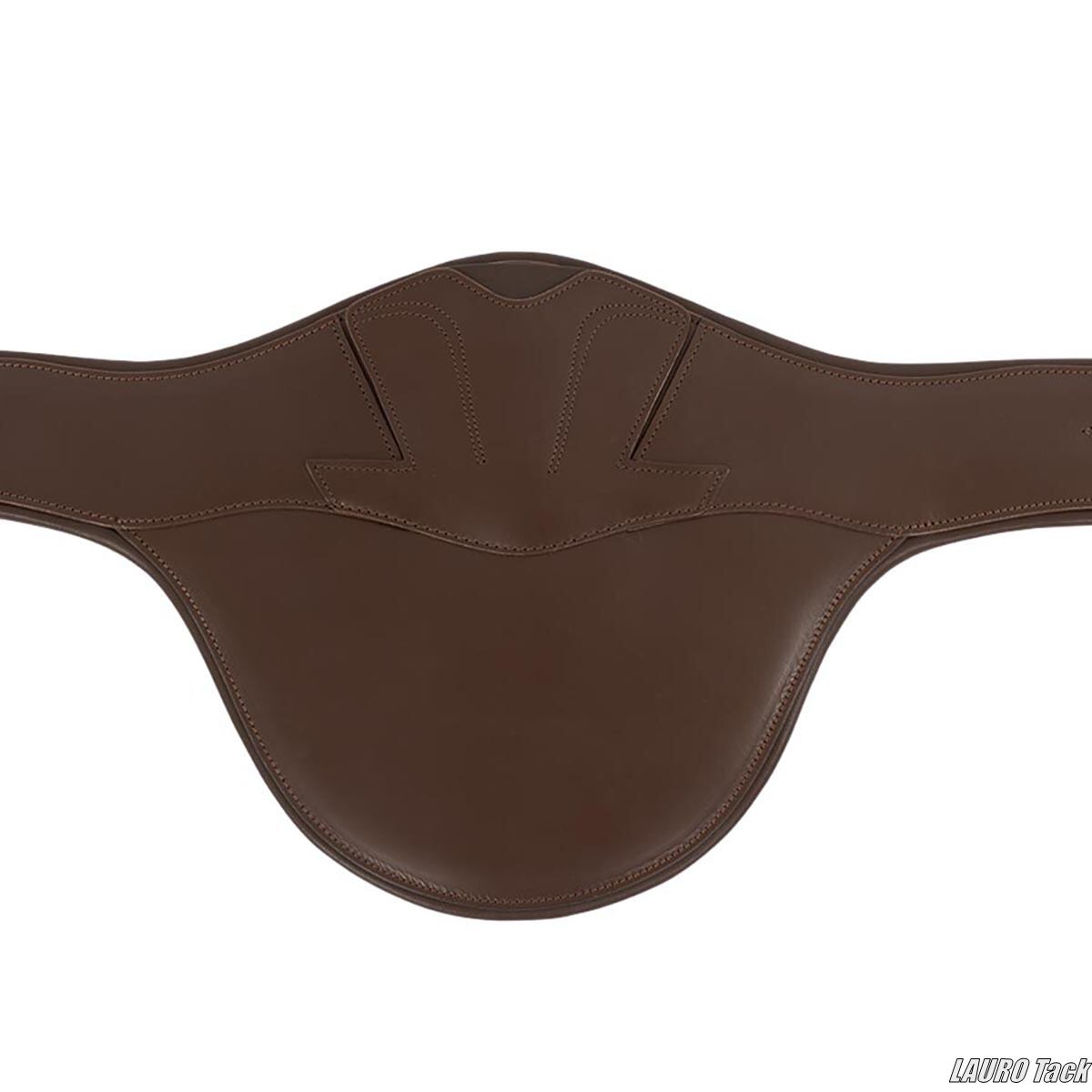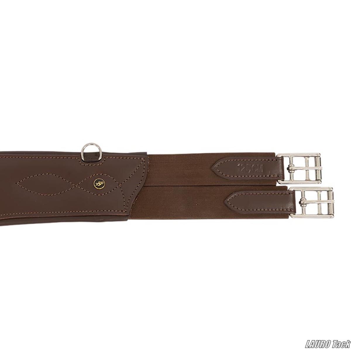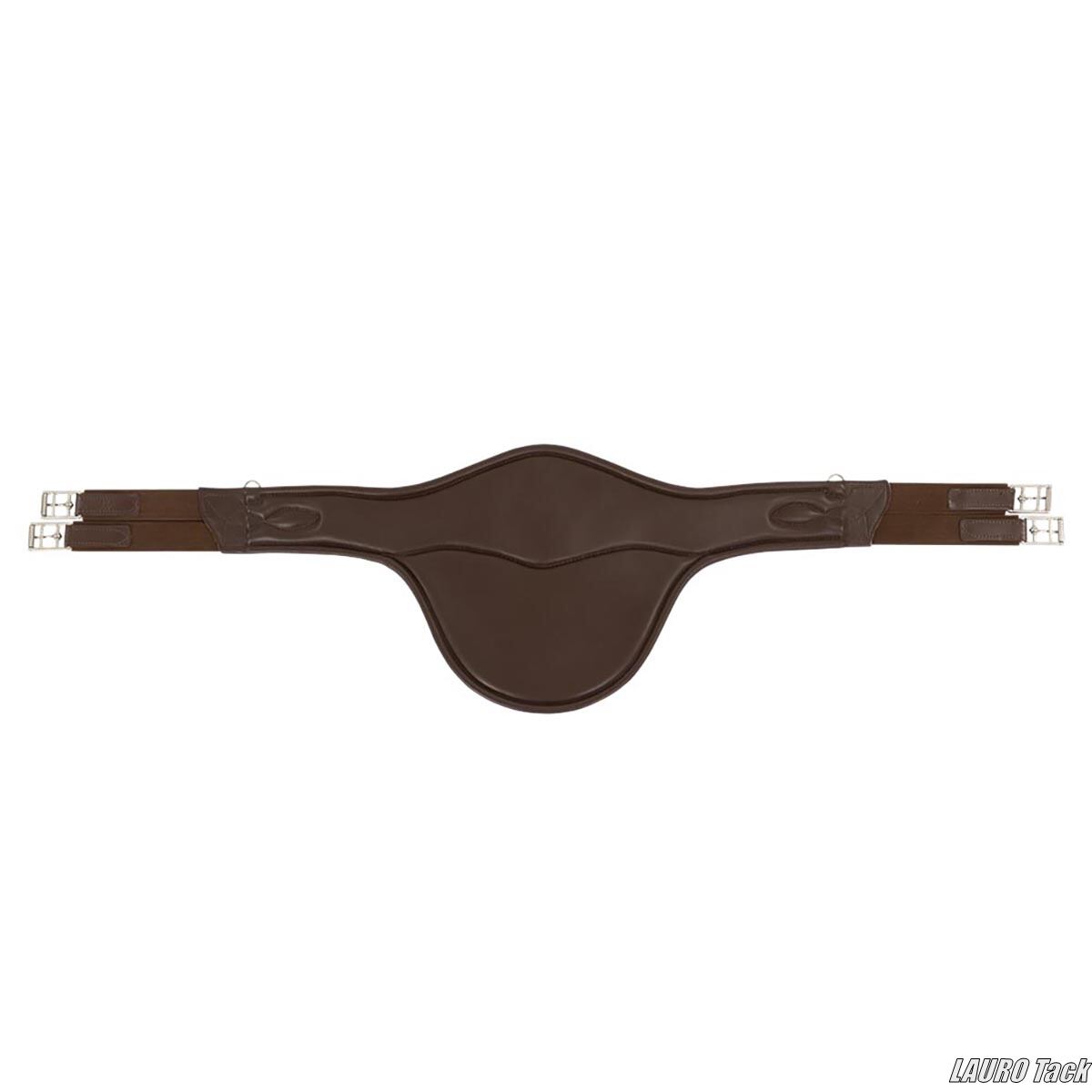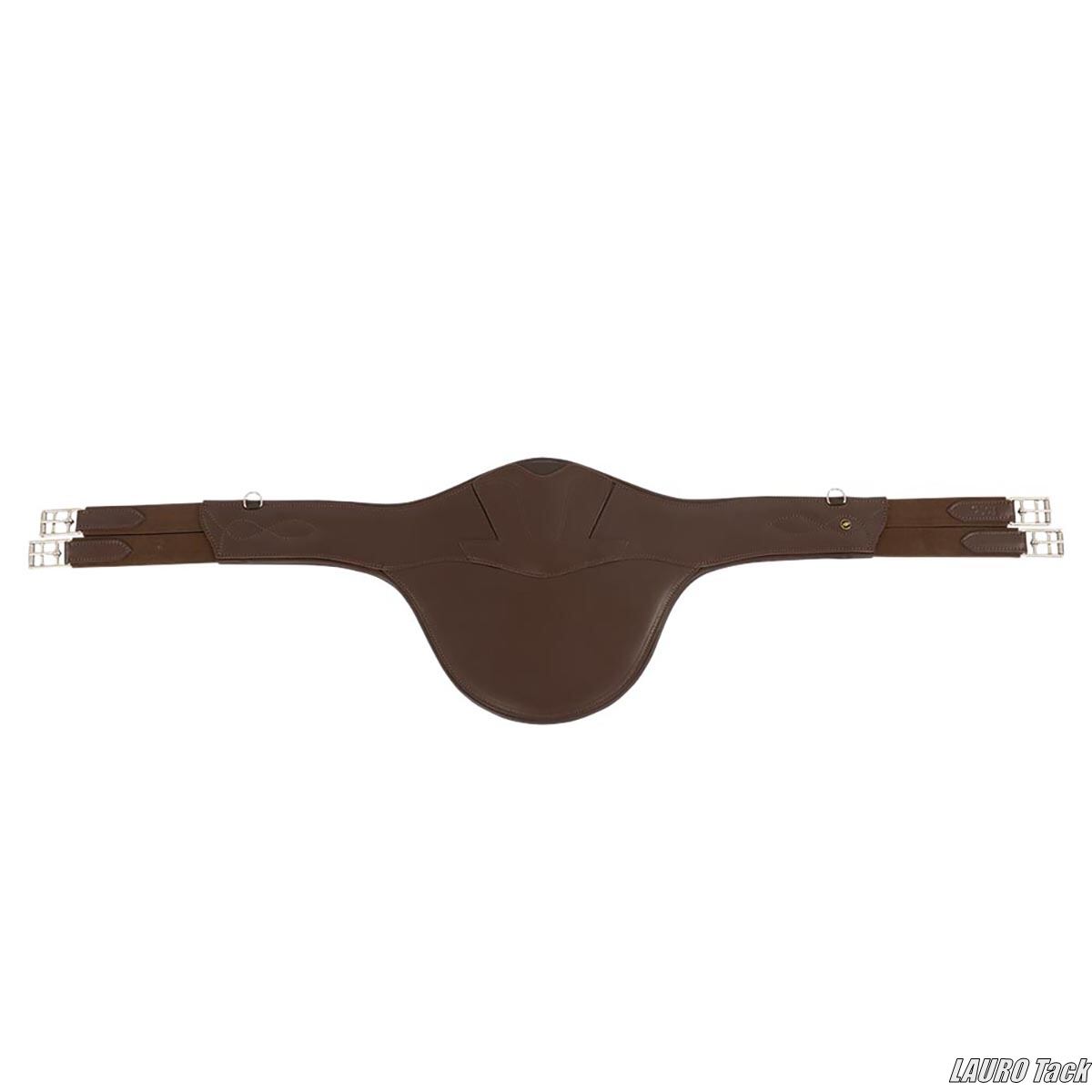 BRの障害用腹帯です。ジャンプ時に腹部を保護するベリーガードが付いています。丈夫な作りです。馬の動きを妨げにくい形状です。中央のフラップにカラビナフックが付いています。フラップは自動で閉じる構造です。両側にゴムが付いています。ステンレススチール製ローラー付きバックルが付いています。補助手綱などを取り付けるための小さなDリングが2つ付いています。装飾ステッチが施されています。