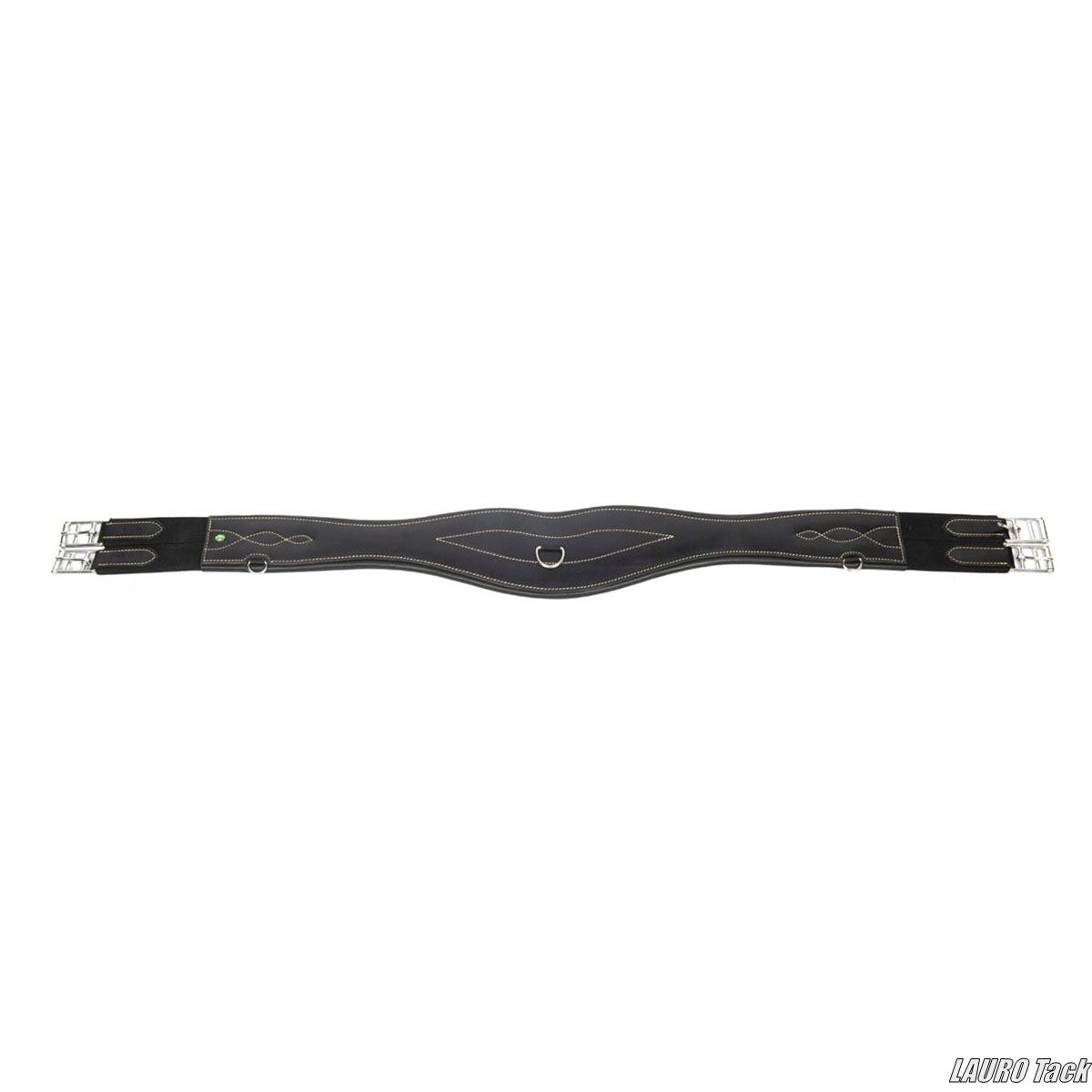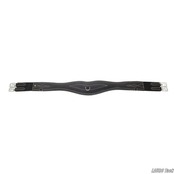 LJ Leathersの障害用腹帯です。幅広のベリーガードが付いています。カーブ形状で馬の動きを妨げにくい設計です。バッファローレザーを使用しています。内側は柔らかい牛革の裏地です。ステンレススチール製ローラー付きバックルが付いています。両側にゴムが付いています。補助手綱やマルタンガルを取り付けるためのDリングが3つ付いています。