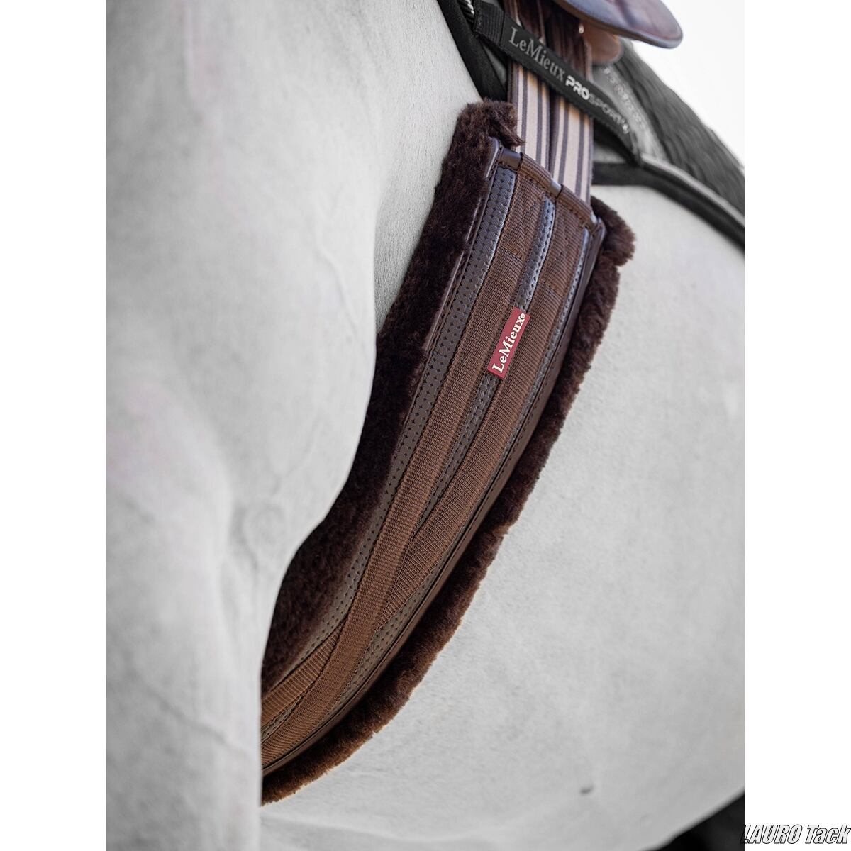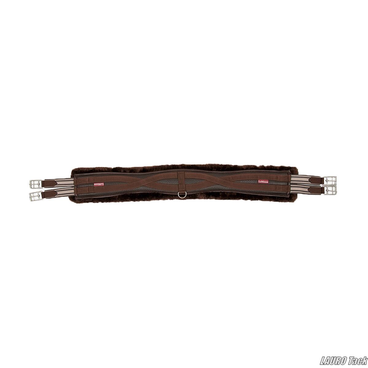LeMieuxの腹帯です。柔らかく快適に装着できます。しっかりした作りです。カーブ形状で馬の動きを妨げにくい設計です。柔らかいフリースの裏地が付いています。敏感な皮膚の馬にも適しています。鞍の安定をサポートします。両端にゴムが付いています。ローラー付きバックルが付いています。中央に補助手綱用のDリングが付いています。