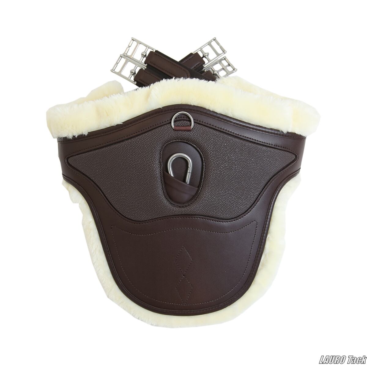 Kentuckyの障害用腹帯です。フェイクレザーを使用しています。幅広のベリーガードがジャンプ時に蹄鉄やスタッドから馬の腹部を保護します。柔らかいフェイクシープスキンの裏地が付き敏感な皮膚の馬にも適しています。裏地は強力な面ファスナーで腹帯に取り付けられています。内部にEVAフォームが入り衝撃を吸収します。三重構造のゴムが付き圧力を均等に分散します。ゴムは非常に丈夫で伸びにくい設計です。補助手綱を取り付けるためのDリングが3つとカラビナが付いています。