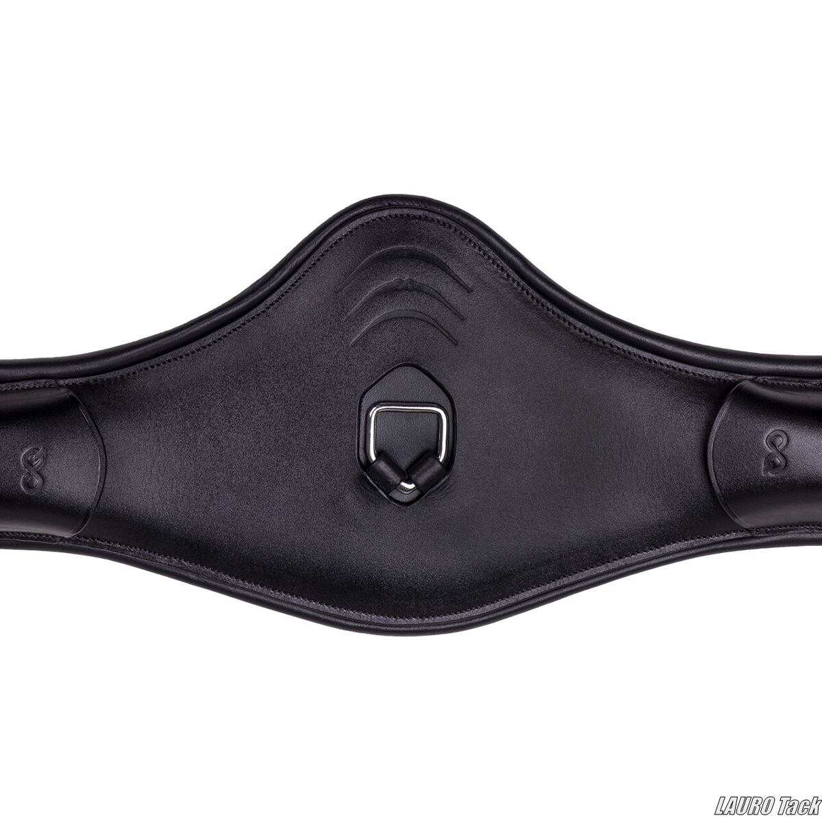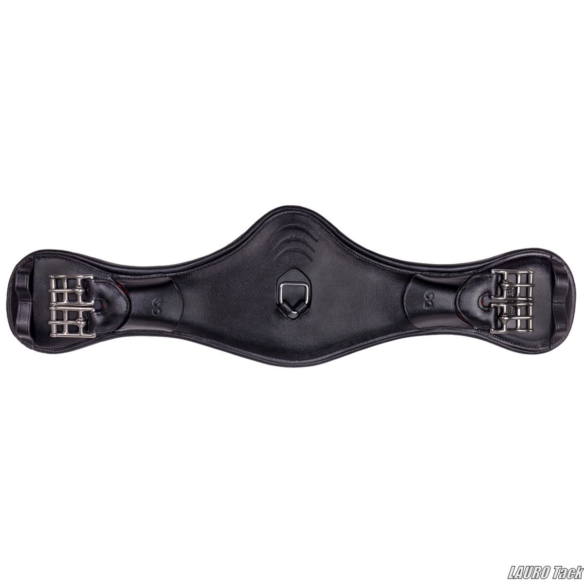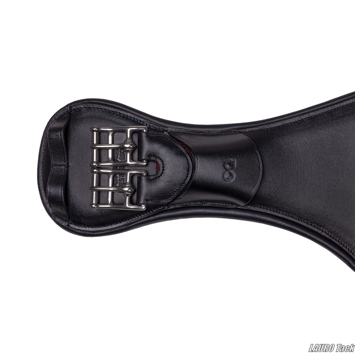 PresTeqの馬場鞍用ショートタイプの腹帯です。カーブ形状で圧力を均等に分散する設計です。非常に柔らかいジェルパッドが入り快適な装着感です。前肢の後ろのラインに沿う形状で馬の動きを妨げにくい設計です。胸骨部分に広い接触面を持ち圧力を分散します。バックルは筋肉の間に位置する設計で圧迫を抑えます。植物タンニンなめしのレザーとステンレススチール金具を使用しています。丸みのある形状で腹帯による擦れや引っ掛かりを防ぎます。