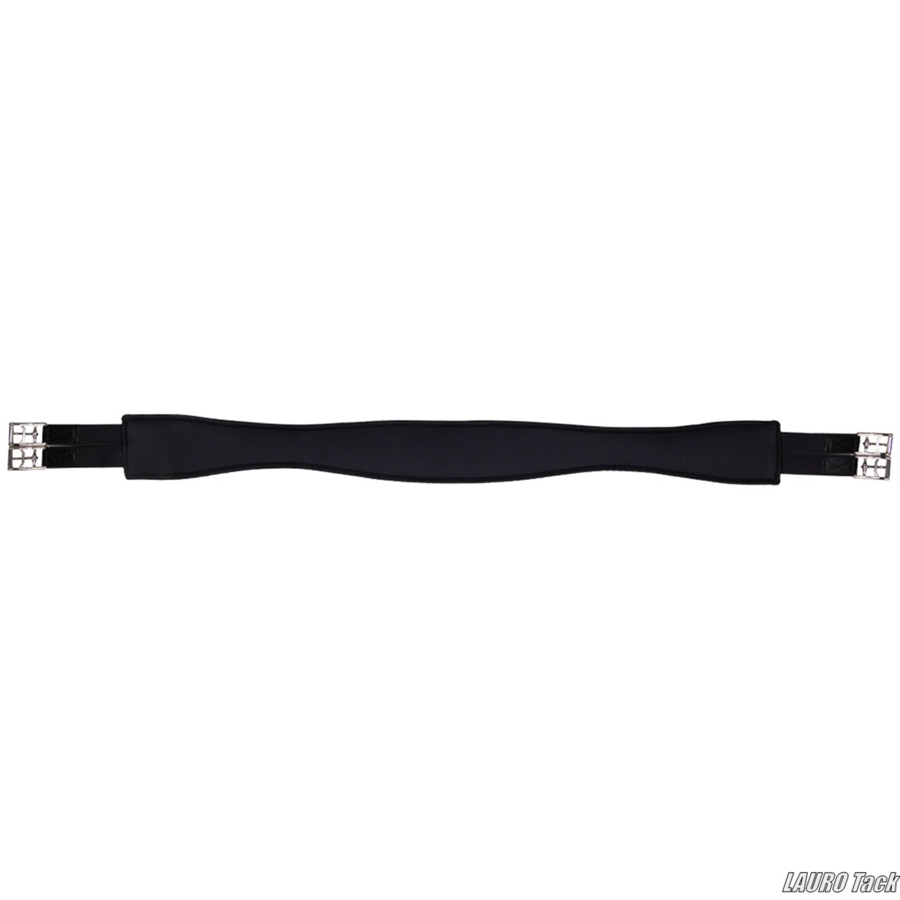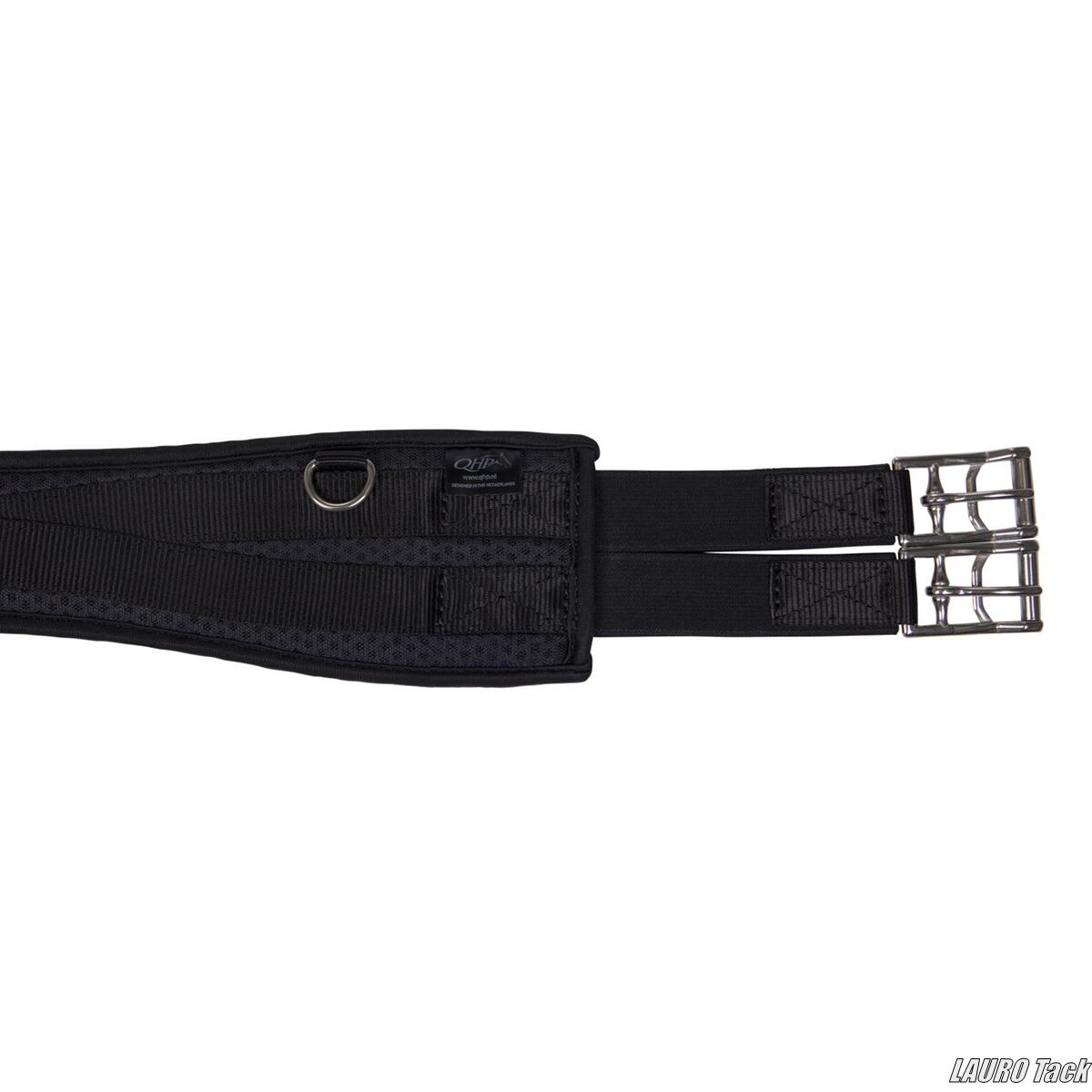 QHPの腹帯です。複数の素材を重ねた構造です。外側はポリエステルメッシュを使用しています。通気性のある裏地で馬が蒸れにくい設計です。中間層にはAir Cycleネオプレンを使用しています。リサイクル素材で通気性があり衝撃を吸収します。ステンレススチール製ローラー付きバックルが付いています。素材はポリエステルです。
